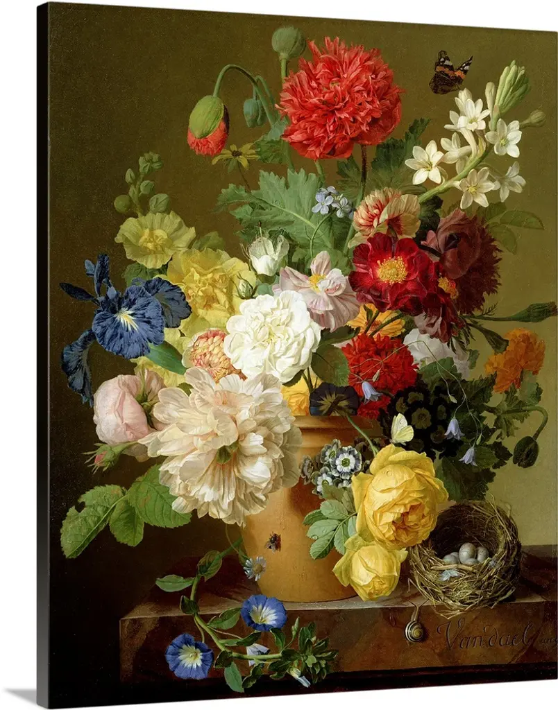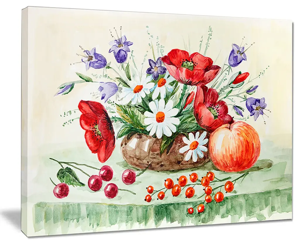 The Bunch of Flowers and Fruits canvas art print is sure to make an impression on anyone who sees it. This artwork is gallery wrapped around a 1-inch solid wood frame and arrives carefully packaged and entirely ready to hang on the wall. Design Art only uses the highest resolution and pigments to ensure a crisp colorful print that is never faded or pixelated. This artwork is sure to be a conversation starter in any home or office.