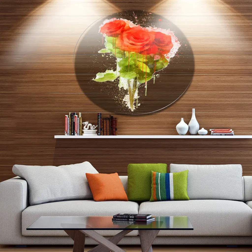 Bring Contemporary Abstraction to your home with this large Circle Metal wall art. This Bunch of Red Roses Watercolor Metal Artwork makes it the focal point of any room or office. - White Gloss Coating ensures colors are extra vibrant with light reflection.- Aluminum grade Sheet Metal with 1 inch mounting frame on the back giving the illusion that the artwork is floating on the wall..- Mounting Brackets are included along with instructions.- High Quality Digital images are created directly into a glossy aluminum panel producing a stunning and captivating print into the glossy finish of the metal.- Water, Fire and Scratch resistant HD Aluminum panels.- Looks better than any photo paper and guaranteed to last at least 20 years- Easy to clean with a microfiber cloth. Colors are far superior to regular Canvas Art. - Easy to Hang