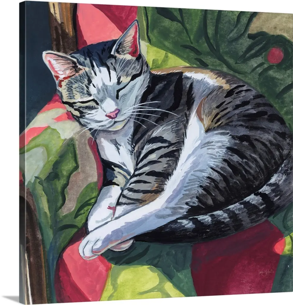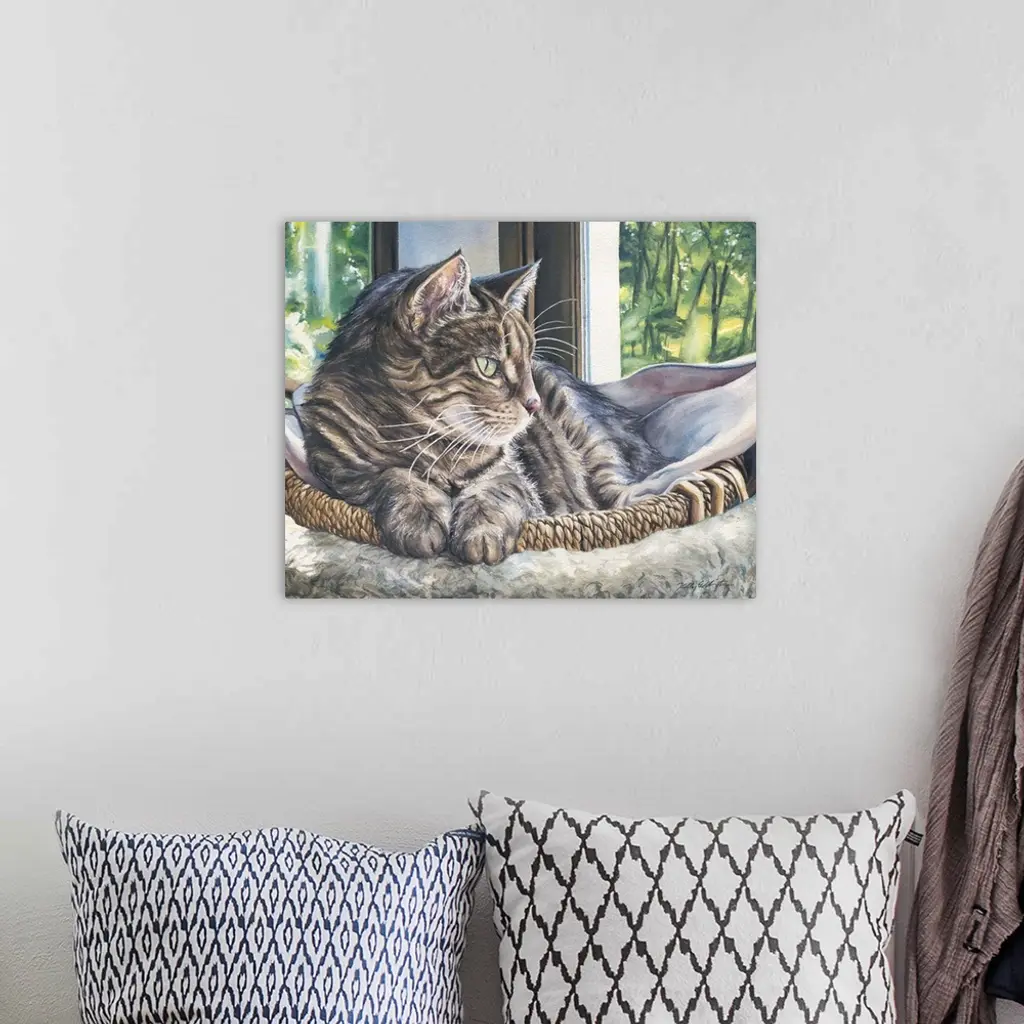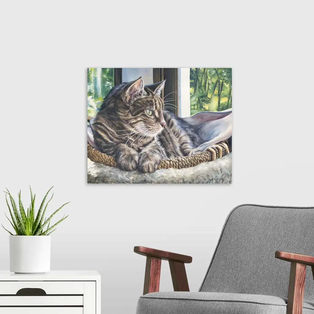 Watercolor painting of a cat about to take an afternoon nap in her basket.