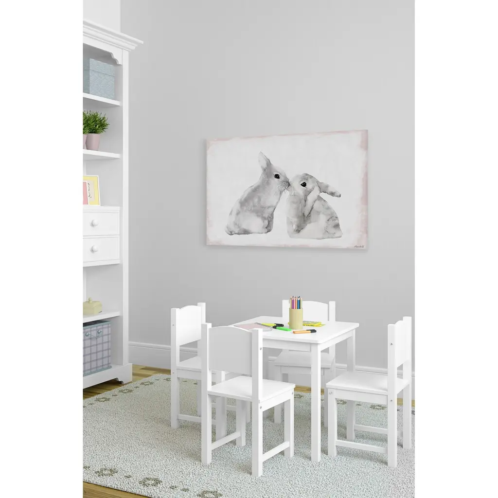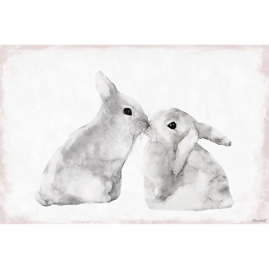 This sweet painting showcases a pair of bunnies appearing to kiss, one with small pointy ears and the other long with longer droopier ones. The colors are soft white, greys, and light pinks. Proudly made in the USA, this piece is printed on canvas before it's stretched over non-warping wooden bars for a gallery-wrapped look. With wall-mounting hooks included, this artful accent is ready to hang up as soon as it reaches your front door. • Durable art print on high quality canvas • Professionally hand stretched • Arrives ready to hang • Gallery wrapped in sustainable, non-warping wood • Includes a certificate of authenticity • Made in the USA