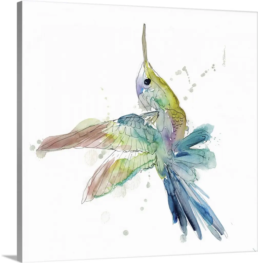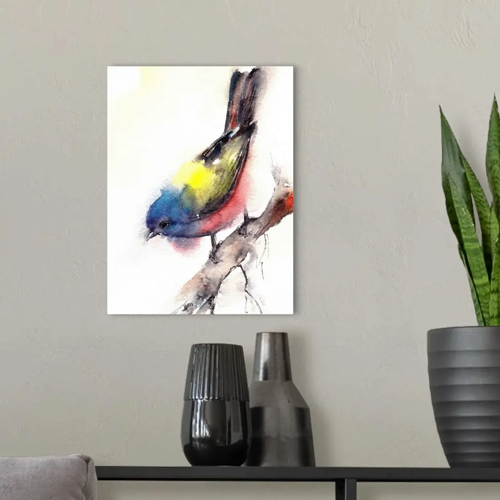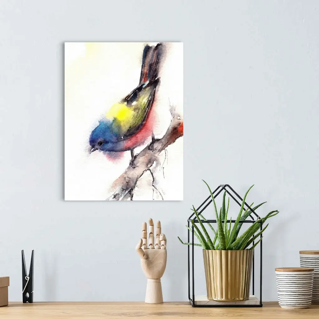 A contemporary watercolor painting of a garden bird on branch against a white background.