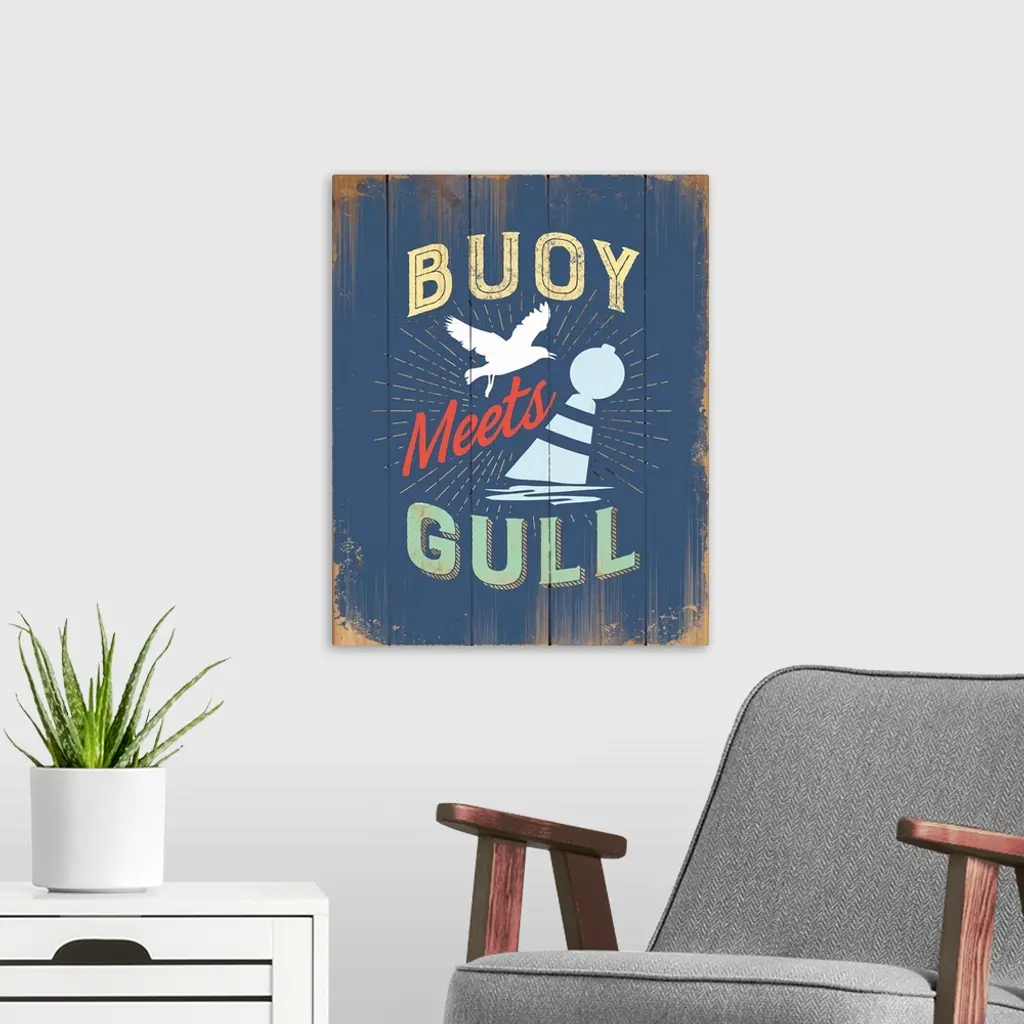 Digital art painting of a poster titled Buoy Meets Gull IN BLUE by JJ Brando.