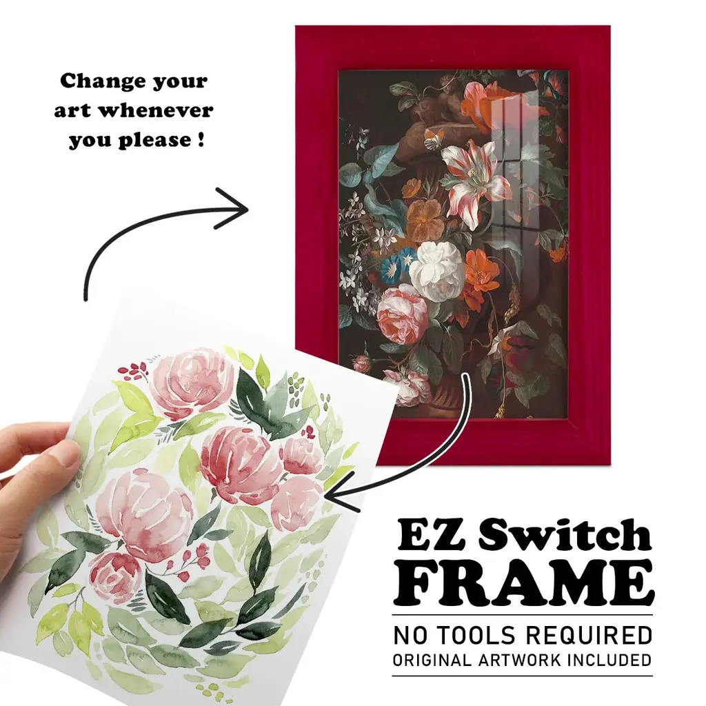 Buoyant Bouquet I -EZ SWITCH Framed Print w/glass-Cherry Red A delightful, framed print. Featuring a solid wood frame with real wood glass. This premium print is giclee quality. In addition, every frame features a removable back and table top stand. This allows you to change your art in the future or to just stand the art on a table for a new look. We are sure you'll enjoy our new series of EZ SWITCH Framed Art. Solid Wood Frame Real Glass Removable / Replaceable Art Built in Tabletop Stand Sizes range from 4x6 up to 12x15 - buy just one or pair them up as sets as you see fit.