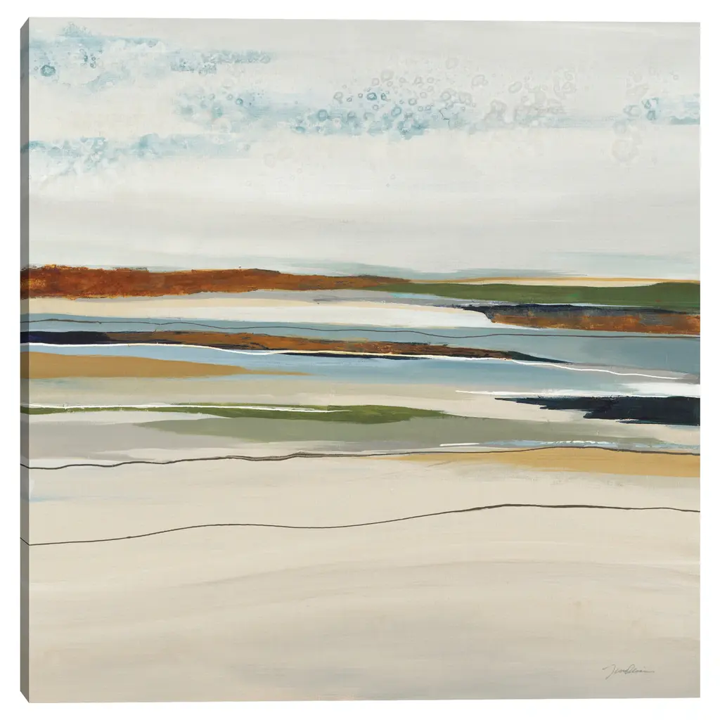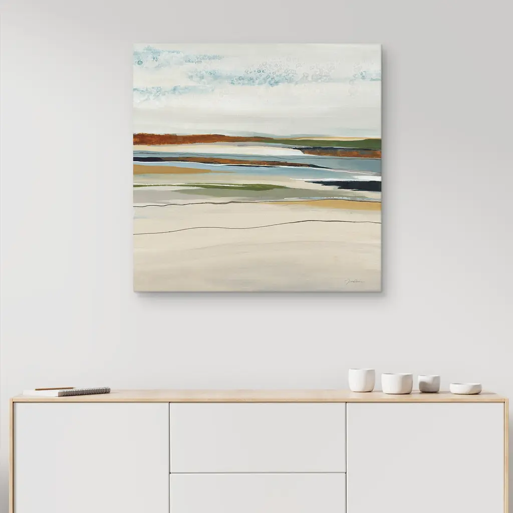 Under an increasingly cloudy sky, Liz Jardine wants us to dig beneath the many layers of cream, brown, gray, and blue to discover a Buried Treasure. This expanse of abstractness does not give us a clue as to where this exciting treasure might be found. This unique piece of wall decor is ready-to-hang and to keep us guessing.