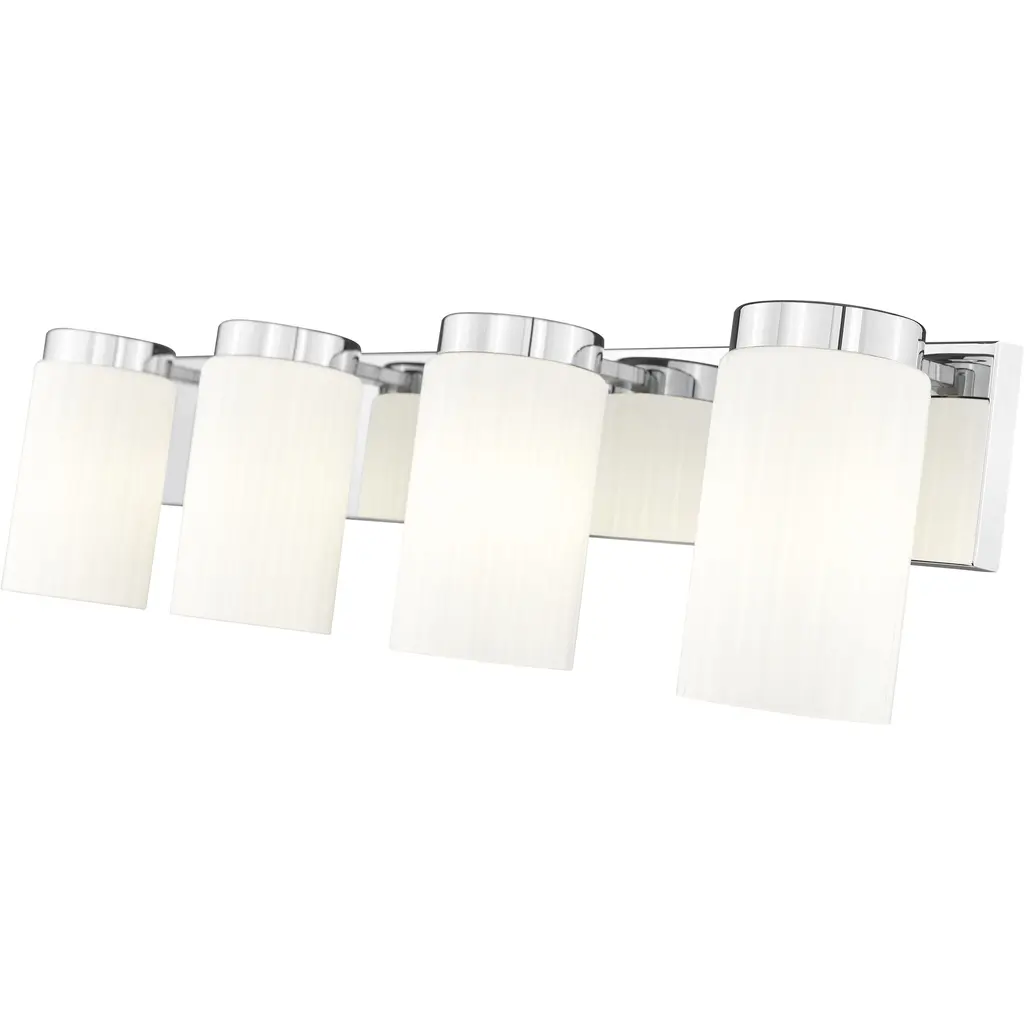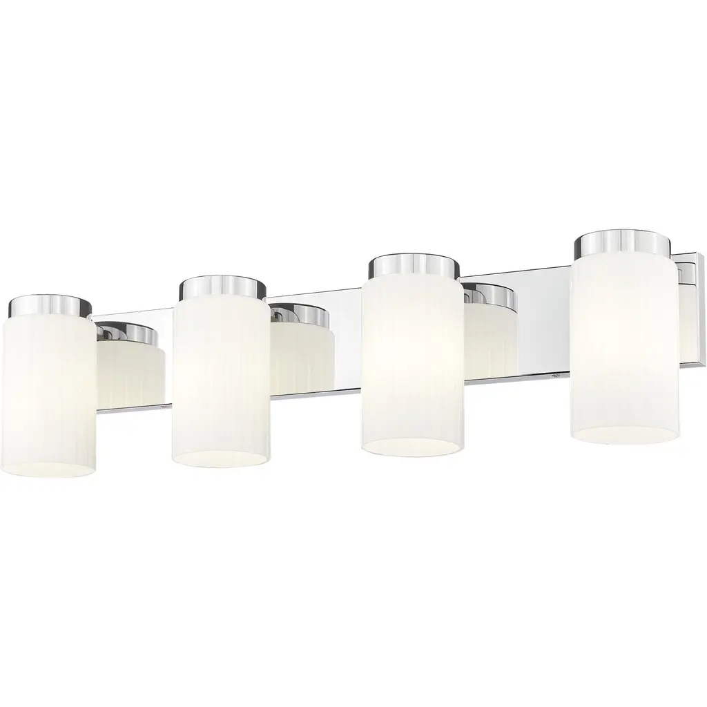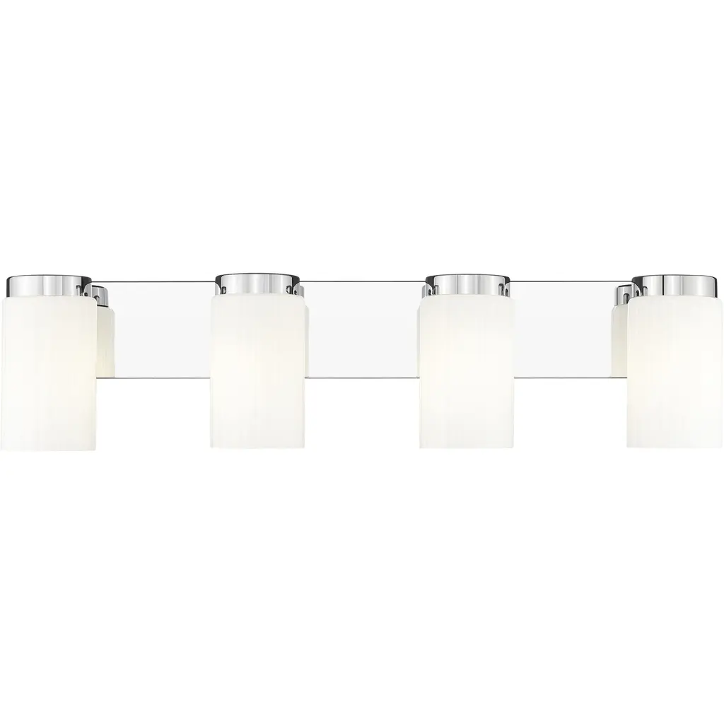 Shining chrome adds depth and gleaming appeal to the contemporary silhouette of this modern four-light vanity fixture. Ideal over a sink and counter, it delivers bright, diffuse illumination with opal glass cylinder shades, each attached with a metal collar that adds depth and definition.