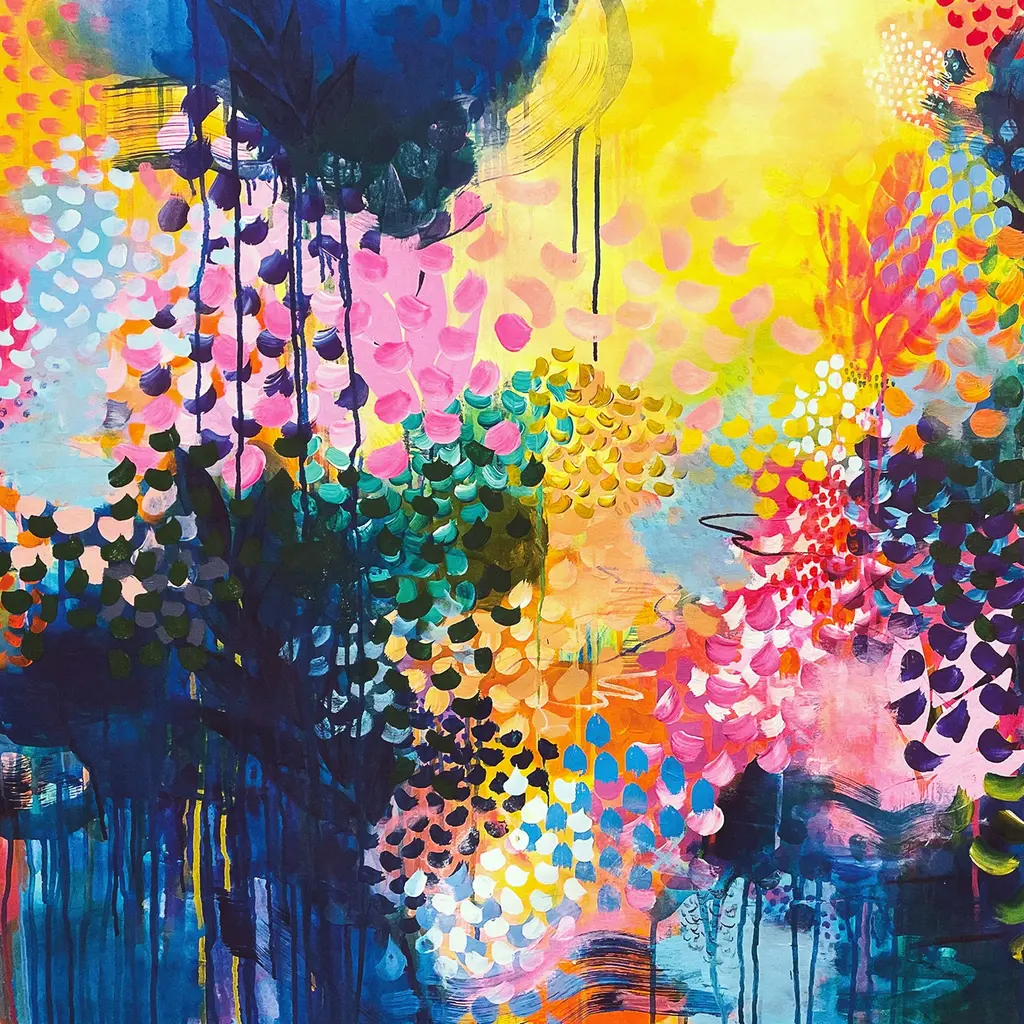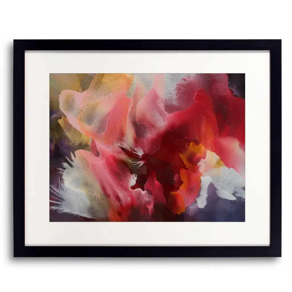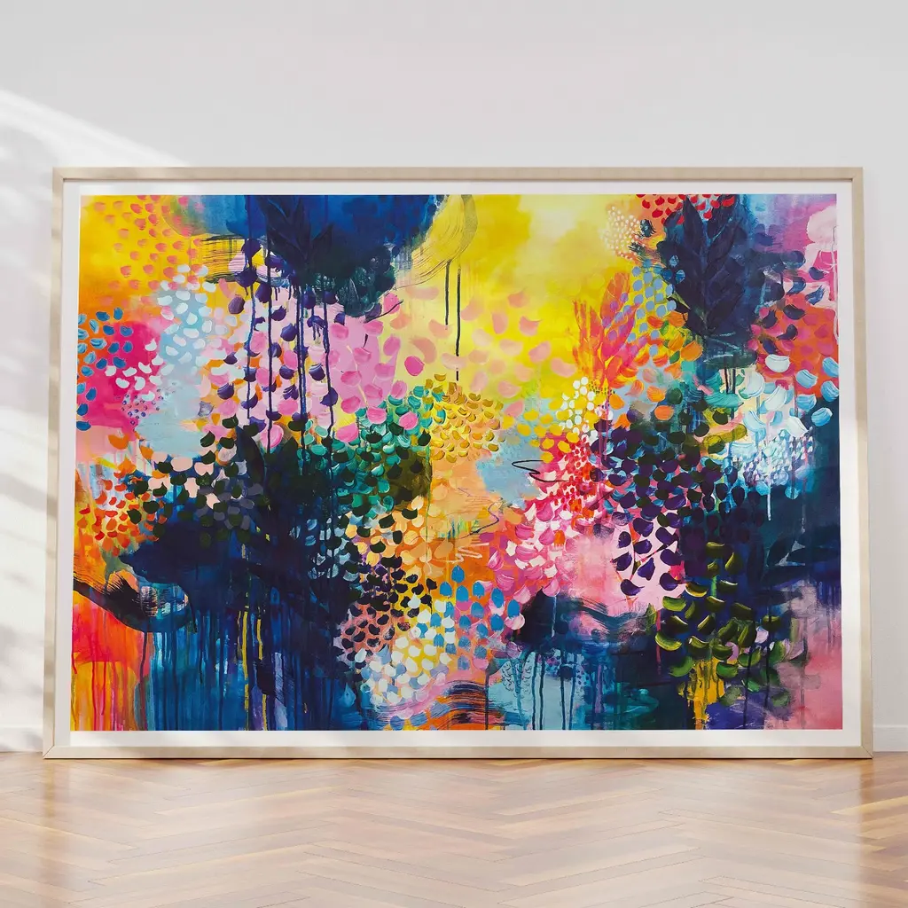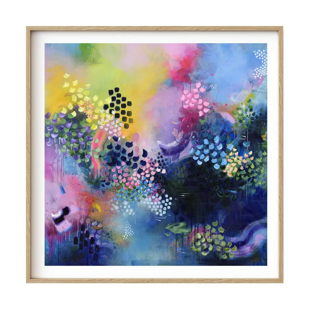 Inspired by burning pink, red and orange Californian sunsets over the glistening ocean, this painting will add energy, vibrancy and act as a great conversation starter within any home. Vibrant pinks, bold oranges, deep blues and striking turquoise are blending together to create a captivating piece that makes a statement. Printed on heavyweight 316gsm cotton rag textured paper using archival-quality inks, this A2 giclée print will maintain its beautiful vibrancy for many years to come. Each print has a white border so it can easily fit into a standard size frame. Print is sold unframed.
