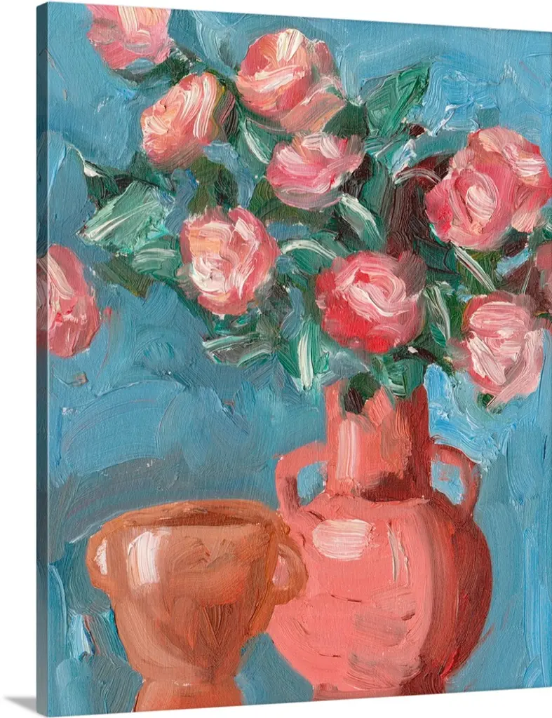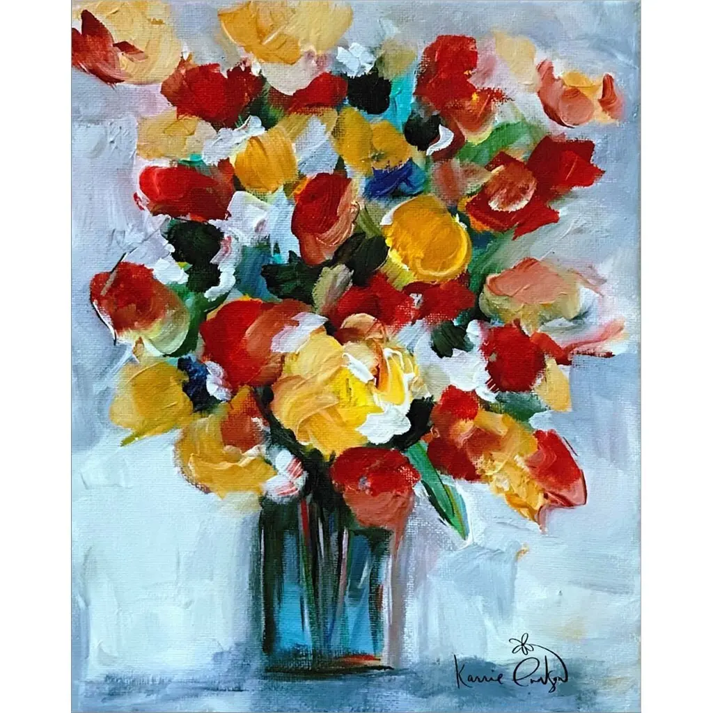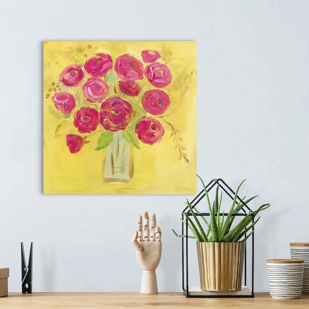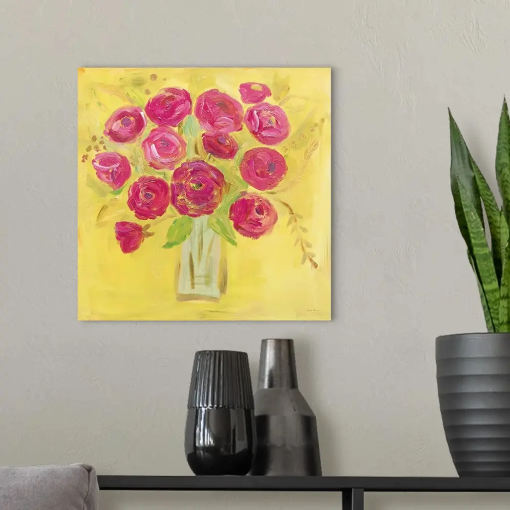 Square contemporary painting of bright pink poppies in a vase with a yellow background.