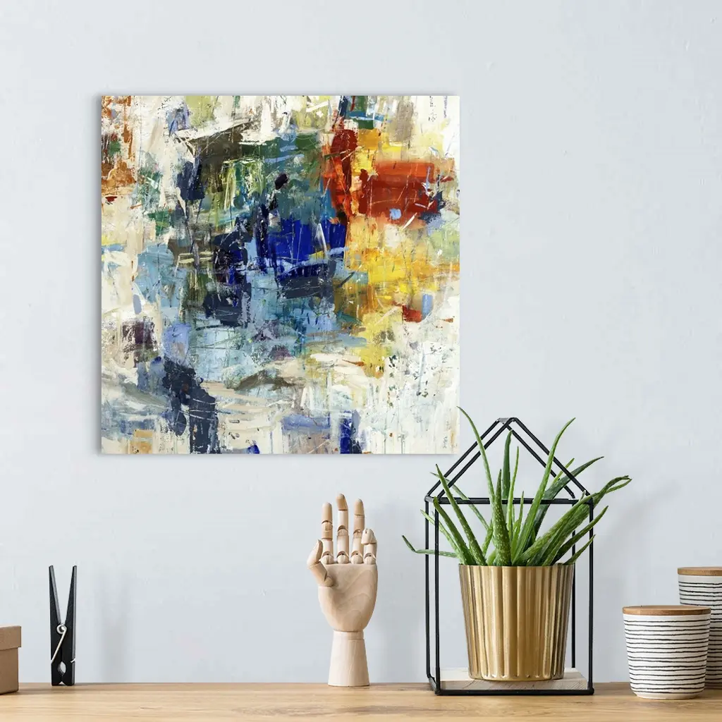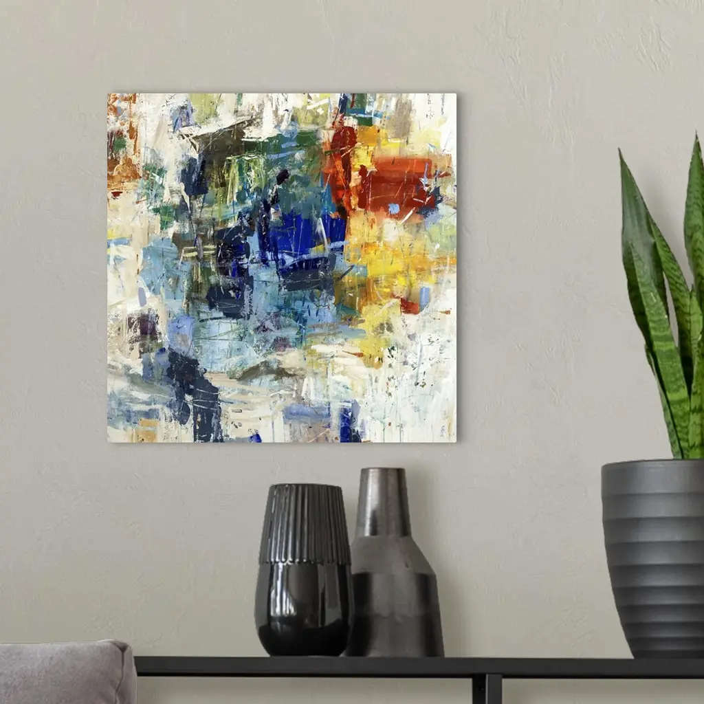 Square abstract painting with various bright colors in the center and more neutral hues around the sides with definite pops of color.