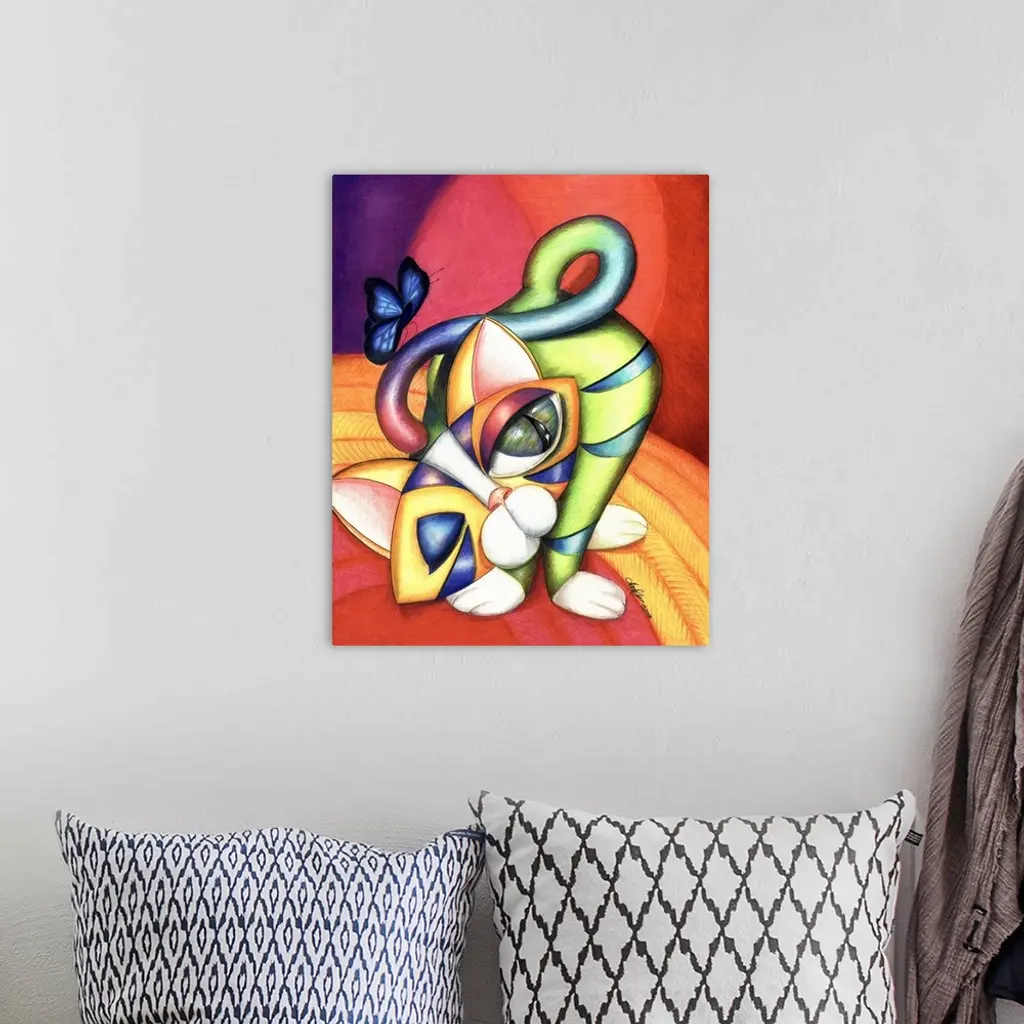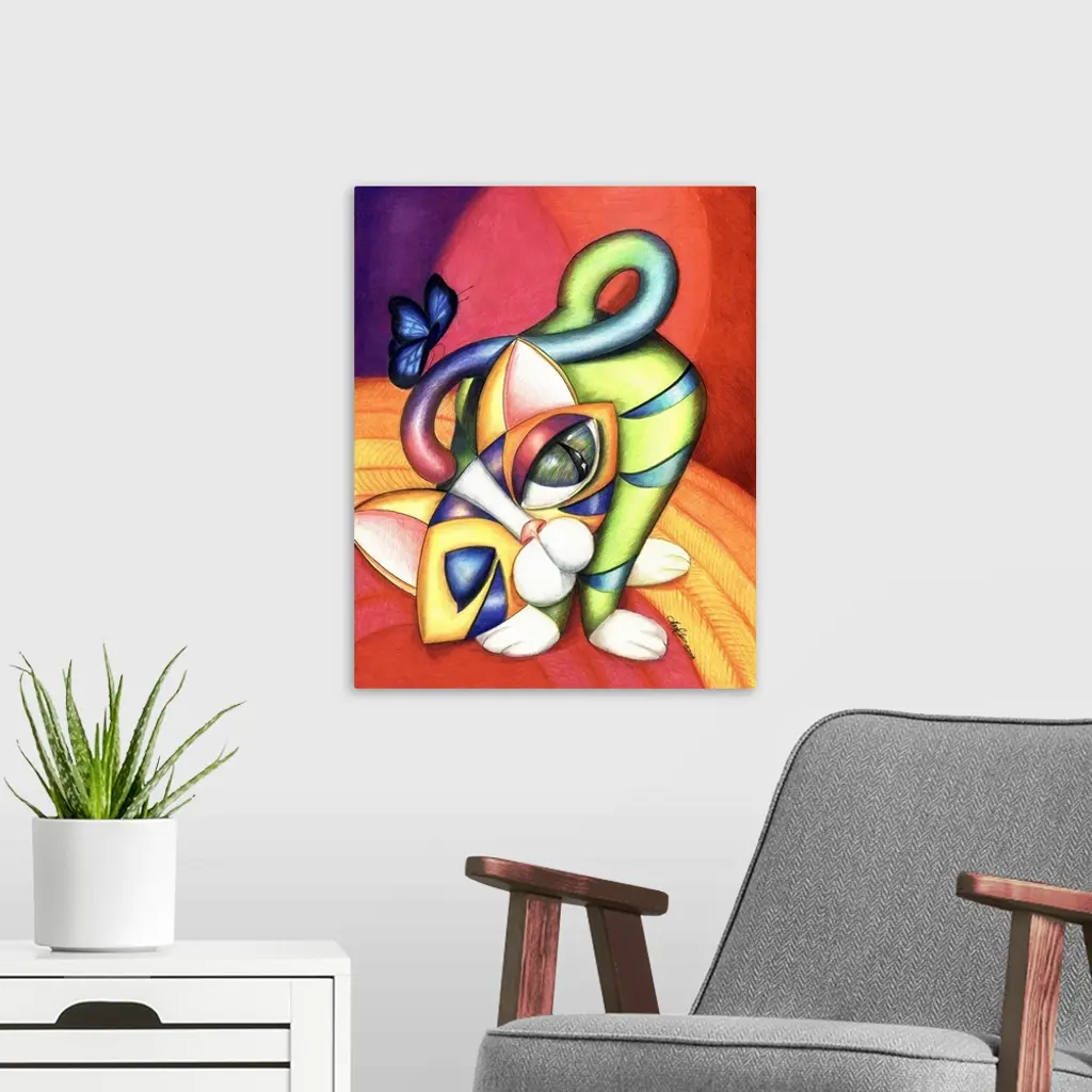 Contemporary artwork in the style of cubism of a cat with a butterfly in bold colors.