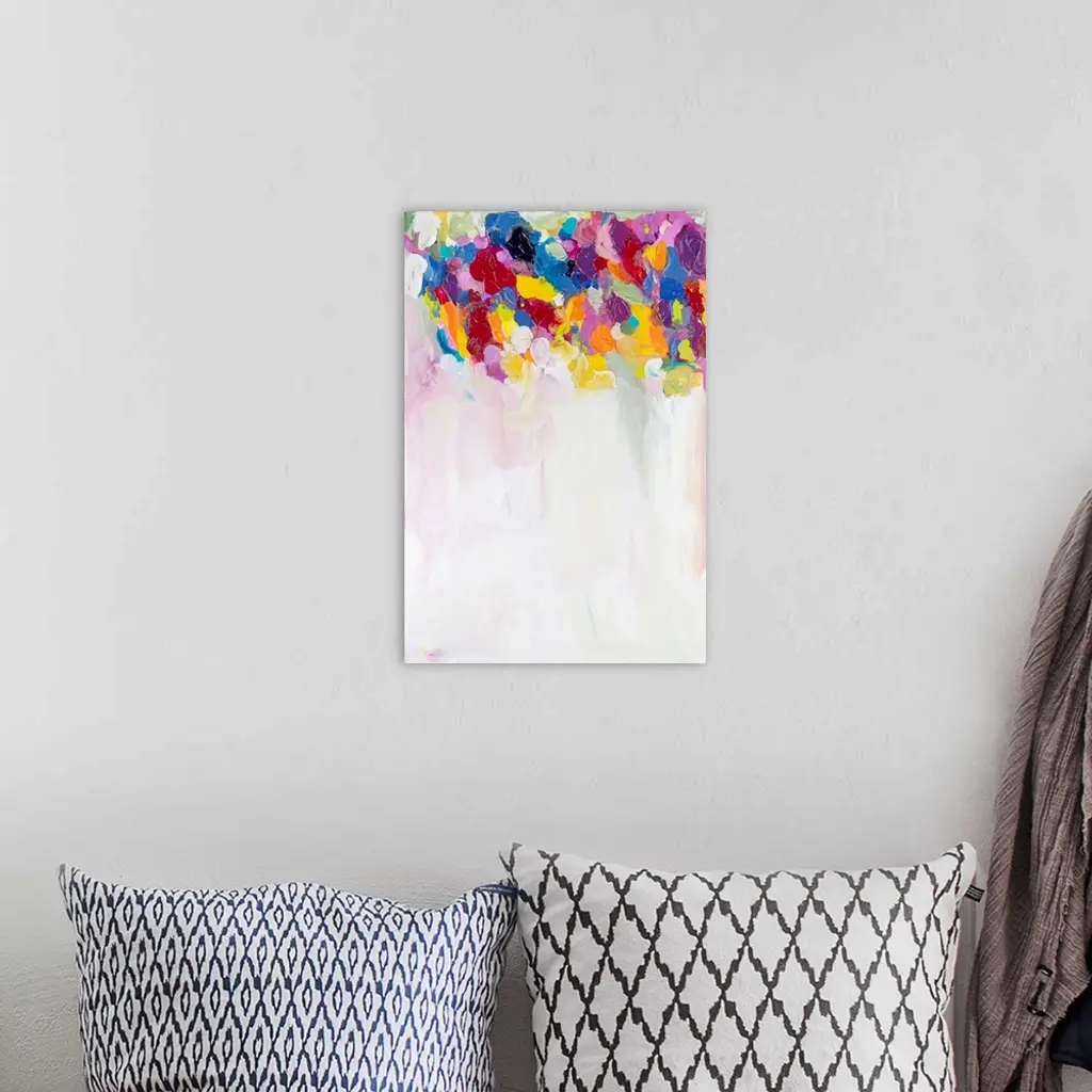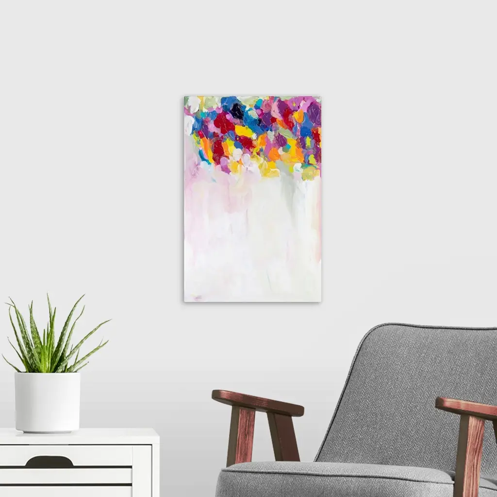 Contemporary abstract painting with colorful spots at the top over a large white area.