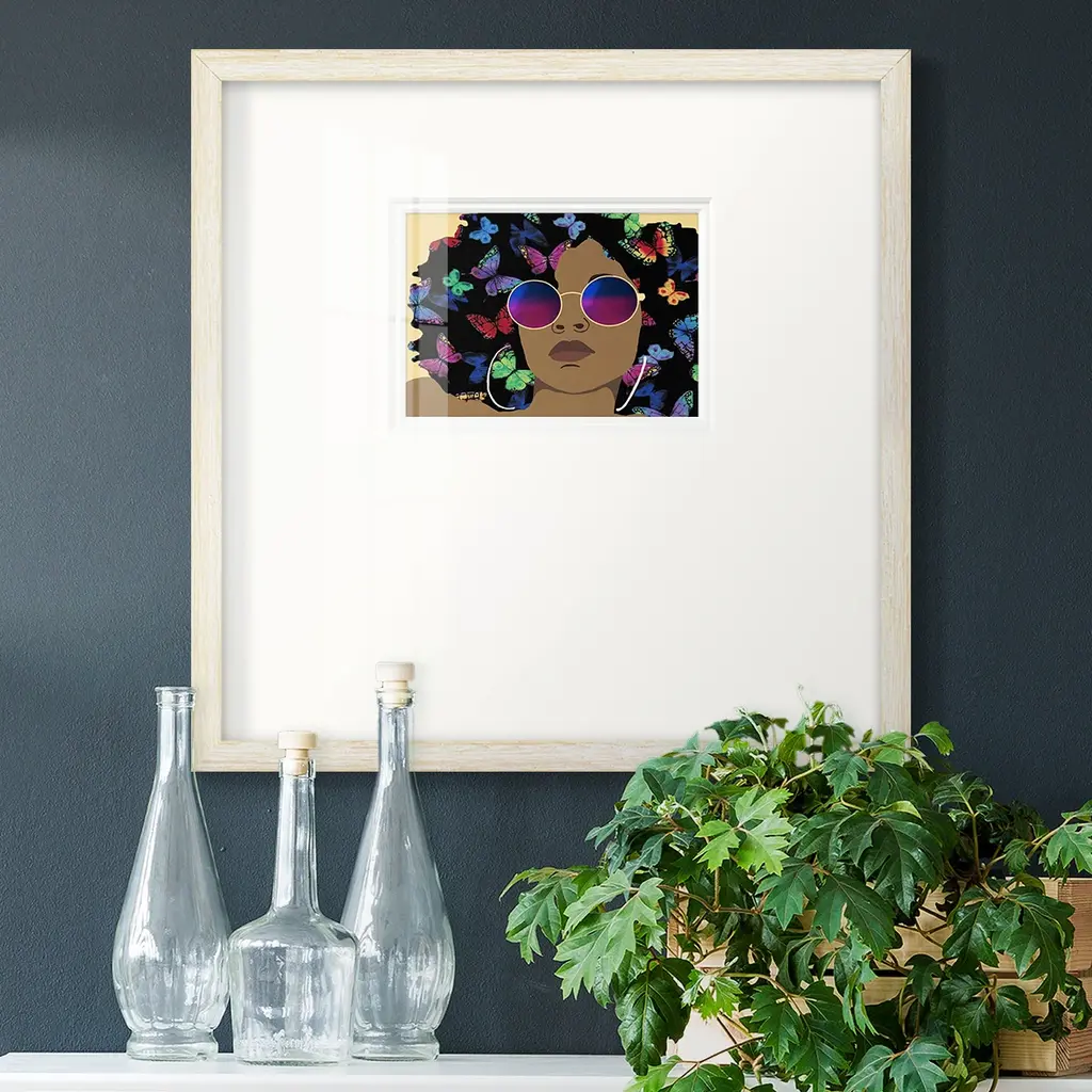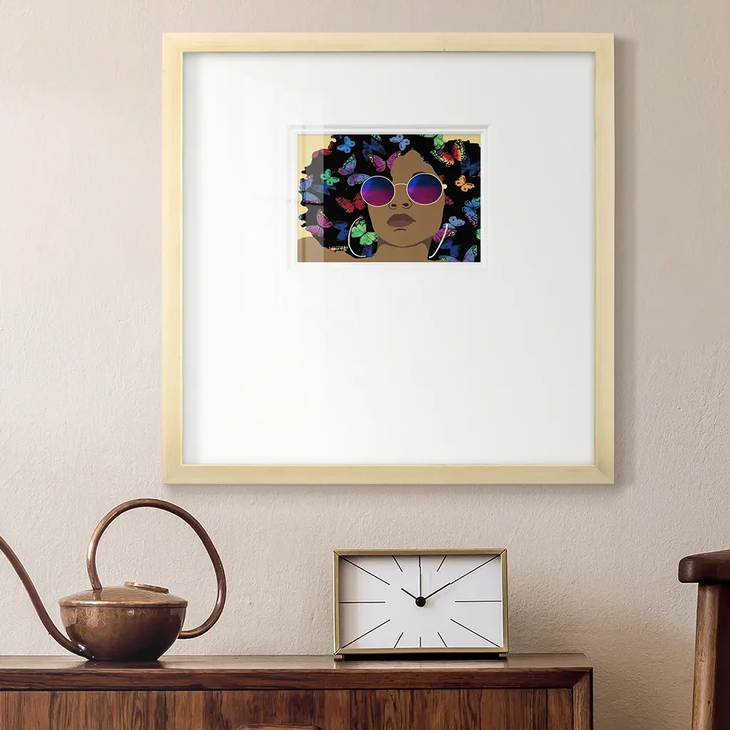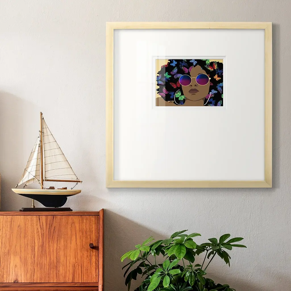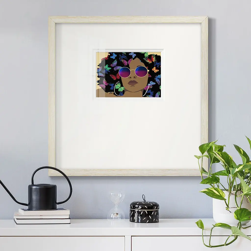 Butterfly Diva IPremium Framed Print A framed cold pressed paper print featuring superior double matting and quality frame. 2 SIZES AVAILABLE 16''X16''' - Overall Size 20''X20''' - Overall Size Each piece is made to order. Each piece comes with hanging hardware. Made in the USA Ready to Hang Giclee Paper Print Plexiglass Beveled Matt Board Double Matte Board