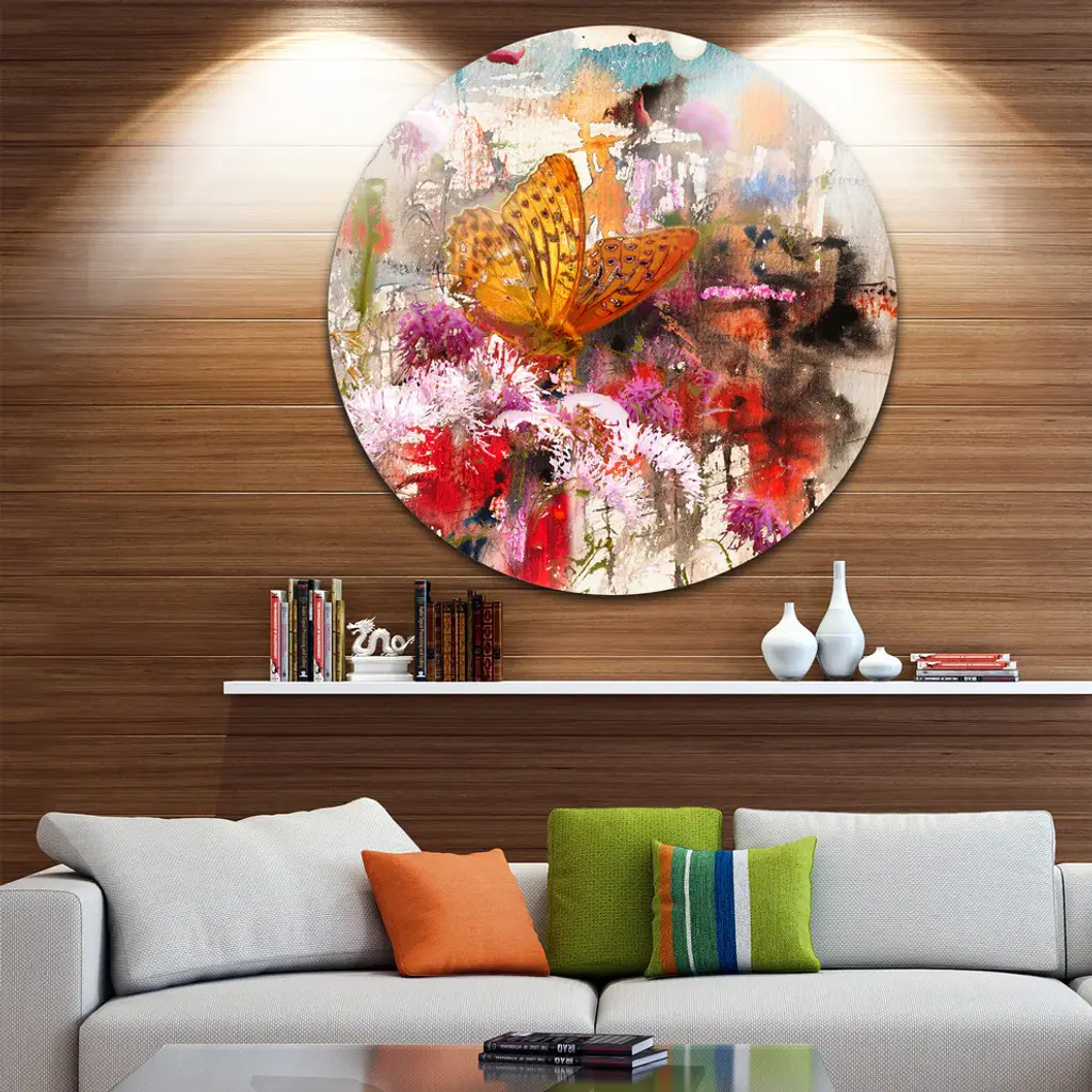 Butterfly Drinking Honey, Floral Round Metal Wall Art, 11"