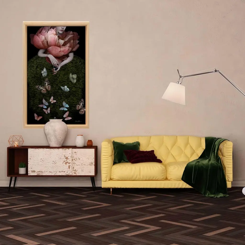 The protagonist of this Pop-Surrealist digital painting is a butterfly hunter, who catches her prey in the palms of her hands to experience the fleeting throb of its wings. She then releases it to fly free and light, like thoughts of joy. Signed, numbered limited edition with “Certificate of Authenticity”. Basswood box frame. Year of Creation: 2015Edition Number: 1/300Artist’s Signature: Printed on the Canvas + original signature on Limited Edition Certificate which will be given with the purchase of the itemCondition: NewMaterials: Cotton canvas, basswood box frame, dried fir structure