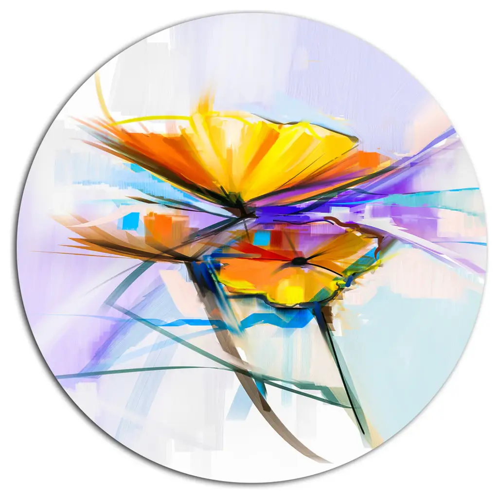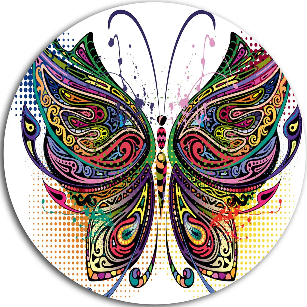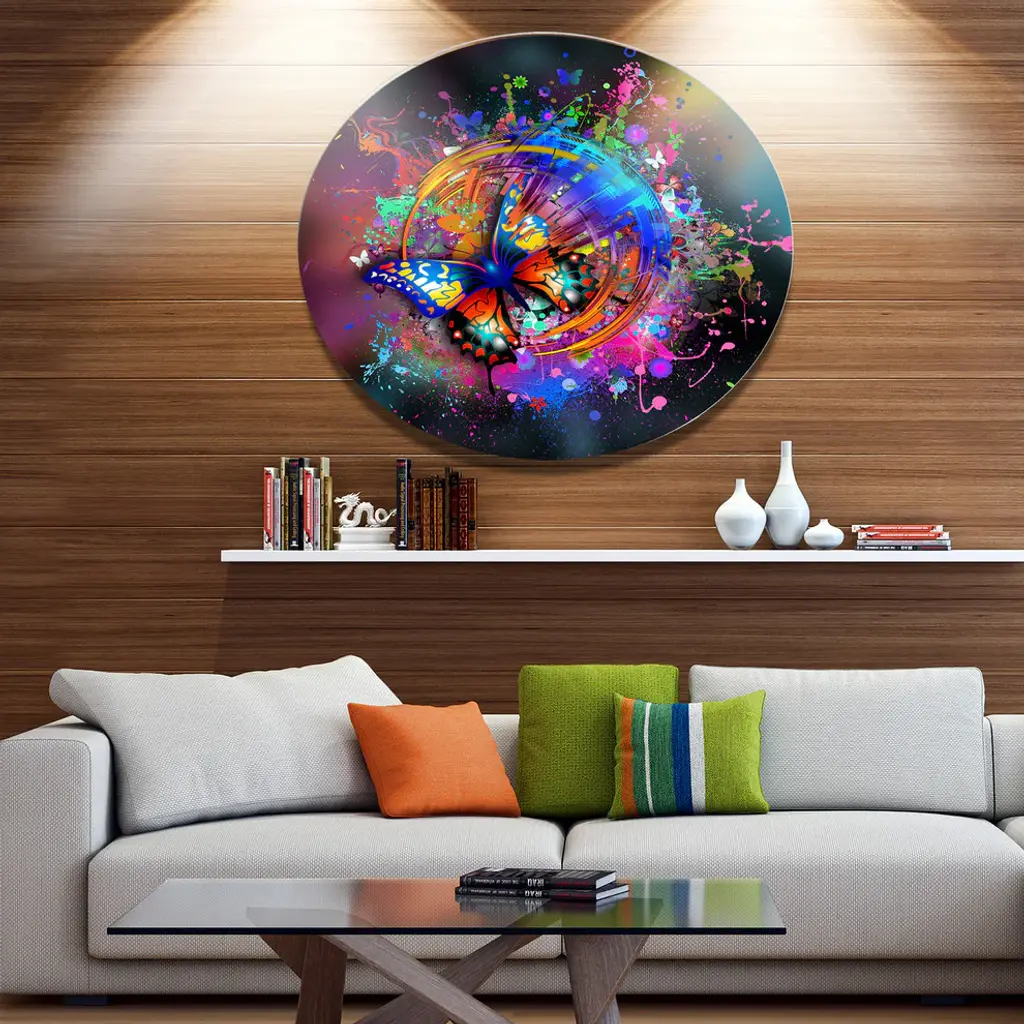 Bring Contemporary Abstraction to your home with this large Circle Metal wall art. This Butterfly over Abstract Background Metal Artwork makes it the focal point of any room or office. - White Gloss Coating ensures colors are extra vibrant with light reflection.- Aluminum grade Sheet Metal with 1 inch mounting frame on the back giving the illusion that the artwork is floating on the wall..- Mounting Brackets are included along with instructions.- High Quality Digital images are created directly into a glossy aluminum panel producing a stunning and captivating print into the glossy finish of the metal.- Water, Fire and Scratch resistant HD Aluminum panels.- Looks better than any photo paper and guaranteed to last at least 20 years- Easy to clean with a microfiber cloth. Colors are far superior to regular Canvas Art. - Easy to Hang