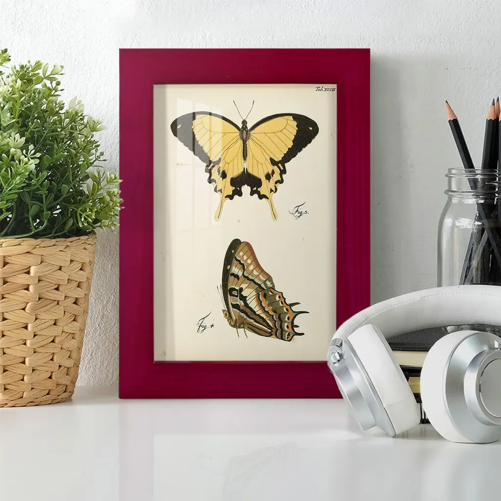 Butterfly Profile II -EZ SWITCH Framed Print w/glass-Cherry Red A delightful, framed print. Featuring a solid wood frame with real wood glass. This premium print is giclee quality. In addition, every frame features a removable back and table top stand. This allows you to change your art in the future or to just stand the art on a table for a new look. We are sure you'll enjoy our new series of EZ SWITCH Framed Art. Solid Wood Frame Real Glass Removable / Replaceable Art Built in Tabletop Stand Sizes range from 4x6 up to 12x15 - buy just one or pair them up as sets as you see fit.