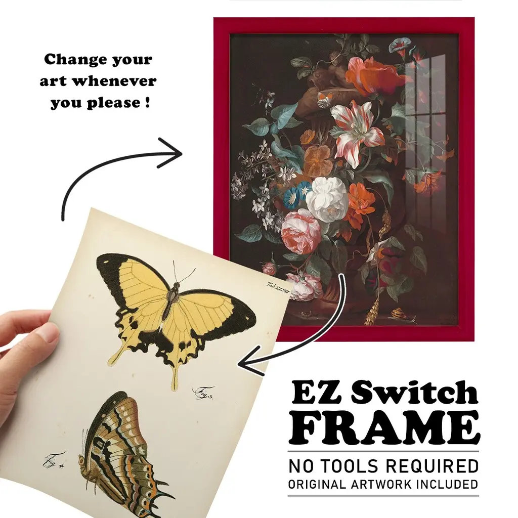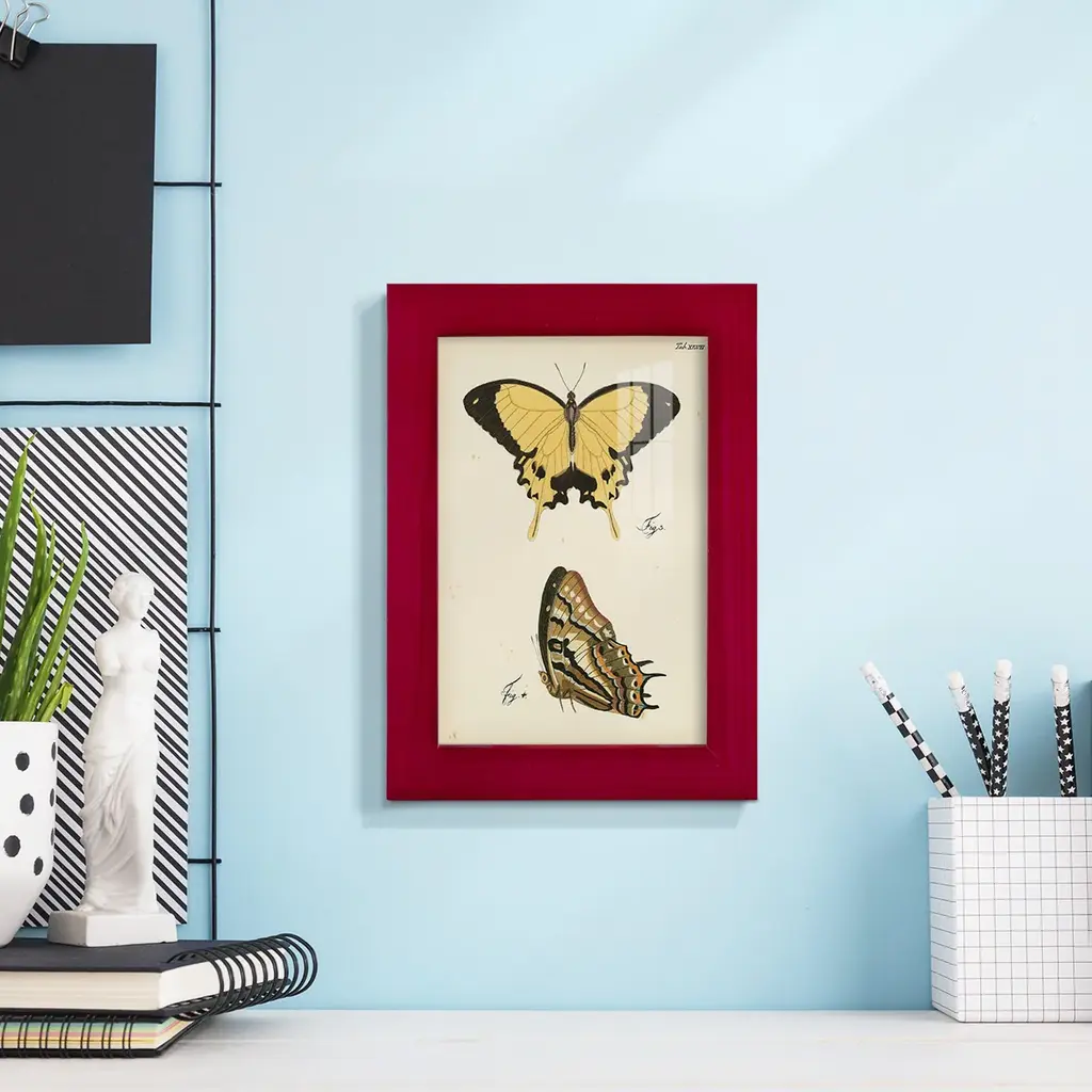Butterfly Profile II -EZ SWITCH Framed Print w/glass-Cherry Red A delightful, framed print. Featuring a solid wood frame with real wood glass. This premium print is giclee quality. In addition, every frame features a removable back and table top stand. This allows you to change your art in the future or to just stand the art on a table for a new look. We are sure you'll enjoy our new series of EZ SWITCH Framed Art. Solid Wood Frame Real Glass Removable / Replaceable Art Built in Tabletop Stand Sizes range from 4x6 up to 12x15 - buy just one or pair them up as sets as you see fit.