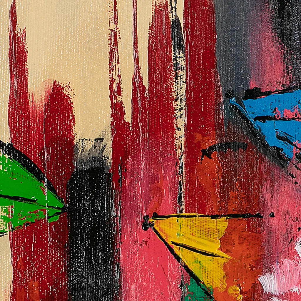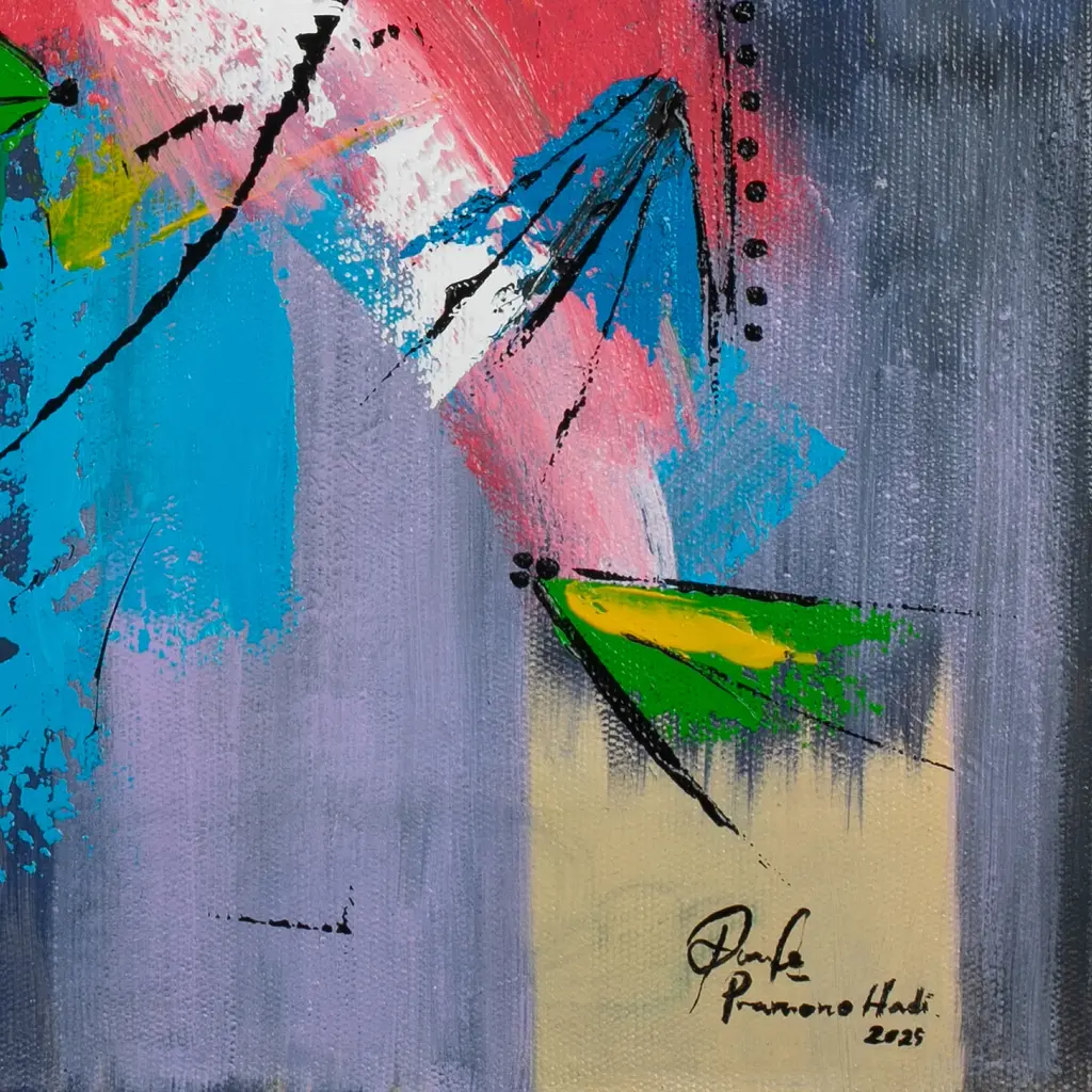 Javanese artist Pramono Hadi brings energy and movement to this abstract composition inspired by butterflies, blending red, blue, yellow, green, black, white and beige in a bold acrylic display. "In our culture, we believe that if a butterfly comes to our house it is a sign that a guest will come and bring good fortune. Butterflies are symbols of love, mercy and perfection," he says. This contemporary painting makes a striking addition to any space.