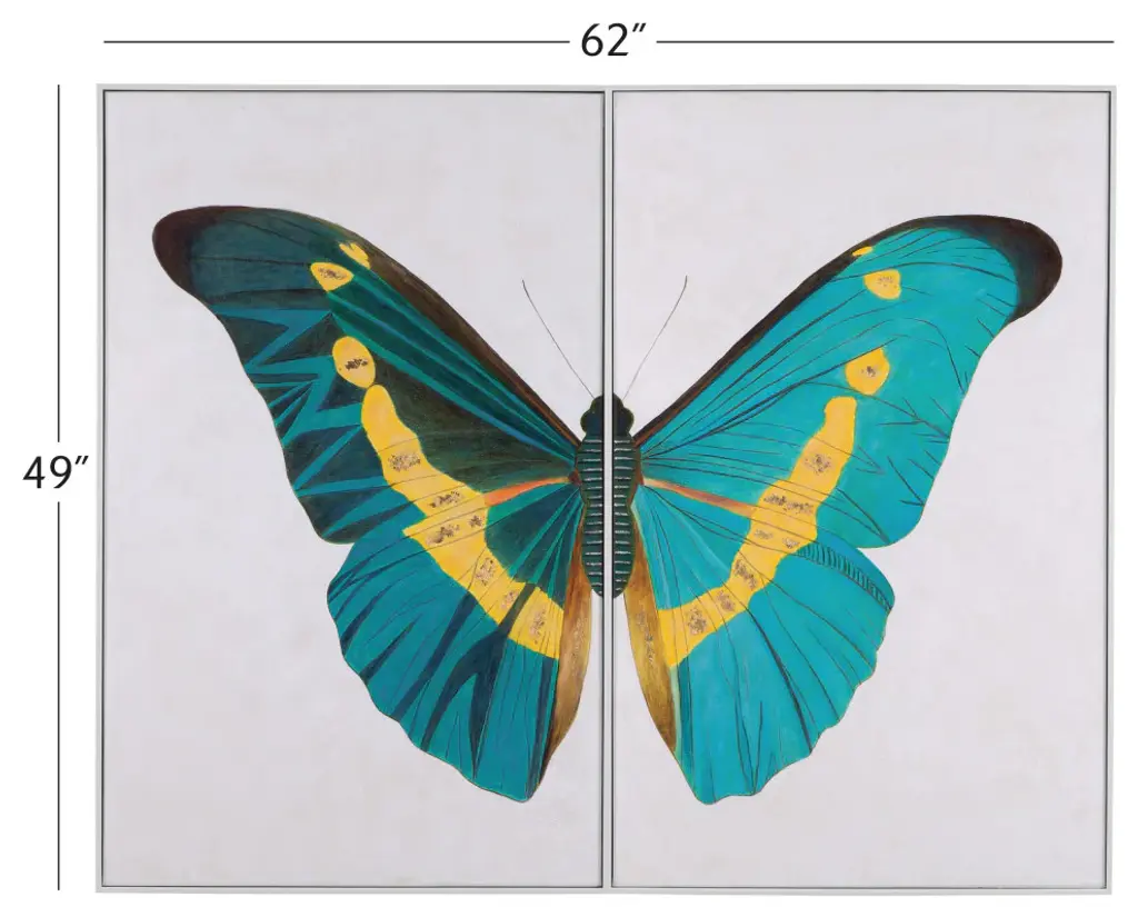 Butterfly Wings is a two piece diptych that is a hand painted canvas in white frames.Features:This piece of art is hand painted by a skilled artist making each piece uniqueNo assembly required. Simply mount to wallHanging hardware includedFor over a century, Bassett Mirror has been synonymous with style and quality, transforming homes with its sophisticated and timeless designs. With a wide-ranging collection of furniture, lighting, mirrors, and art, Bassett Mirror seamlessly blends modern style with classic appeal. From rustic modern to luxe glam, each piece is thoughtfully crafted to inspire and elevate any space. Committed to exceptional value and customer care, Bassett Mirror makes it easy for homeowners to create beautiful, personalized interiors with confidence.