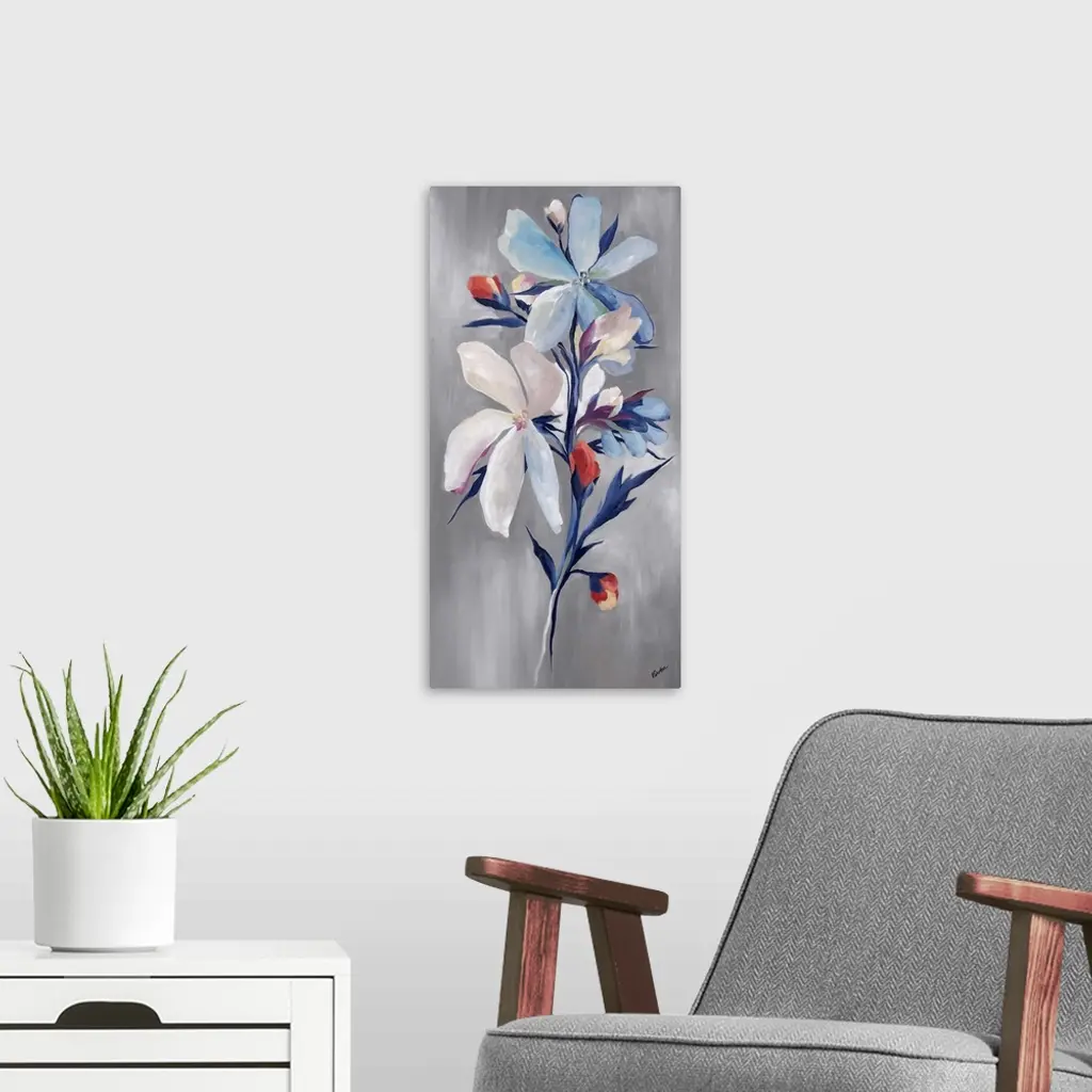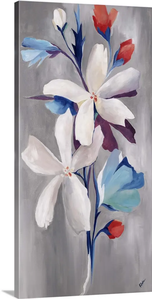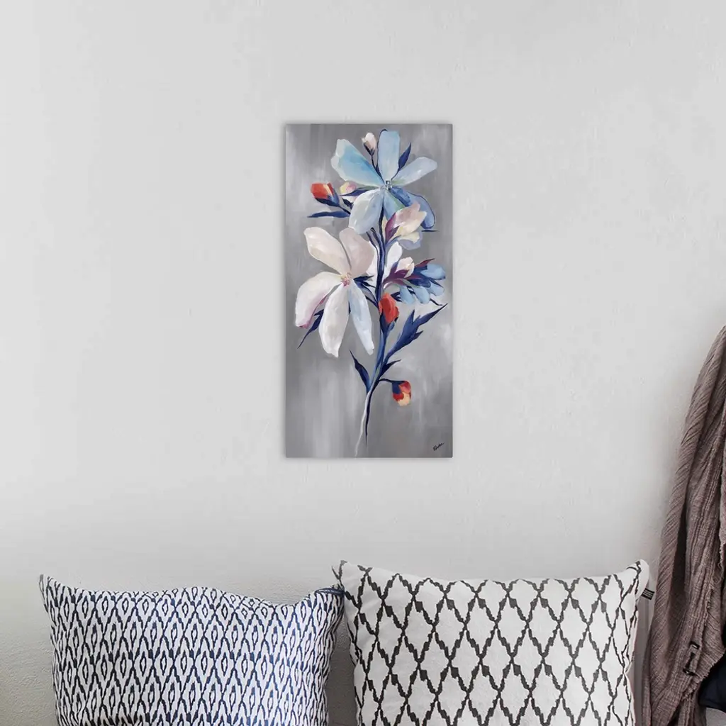 Contemporary painting of a floral arrangement of blue flowers with accents of little red buds.