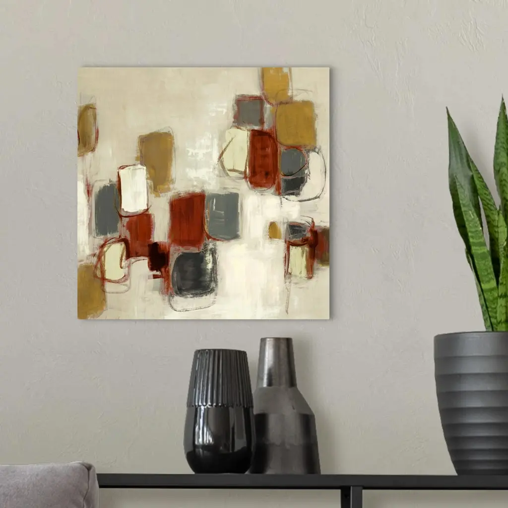 Patches of colored squares on a stark background are featured in this abstract painting by Lanie Loreth.