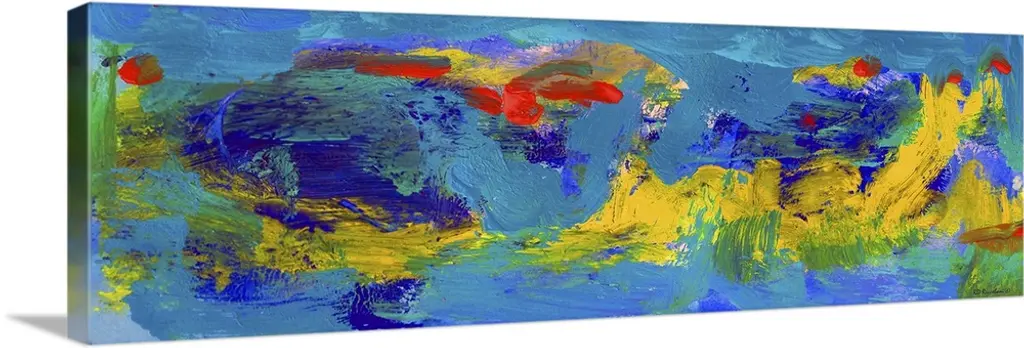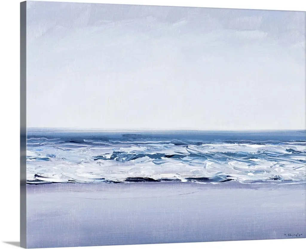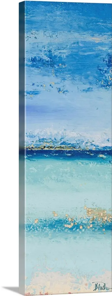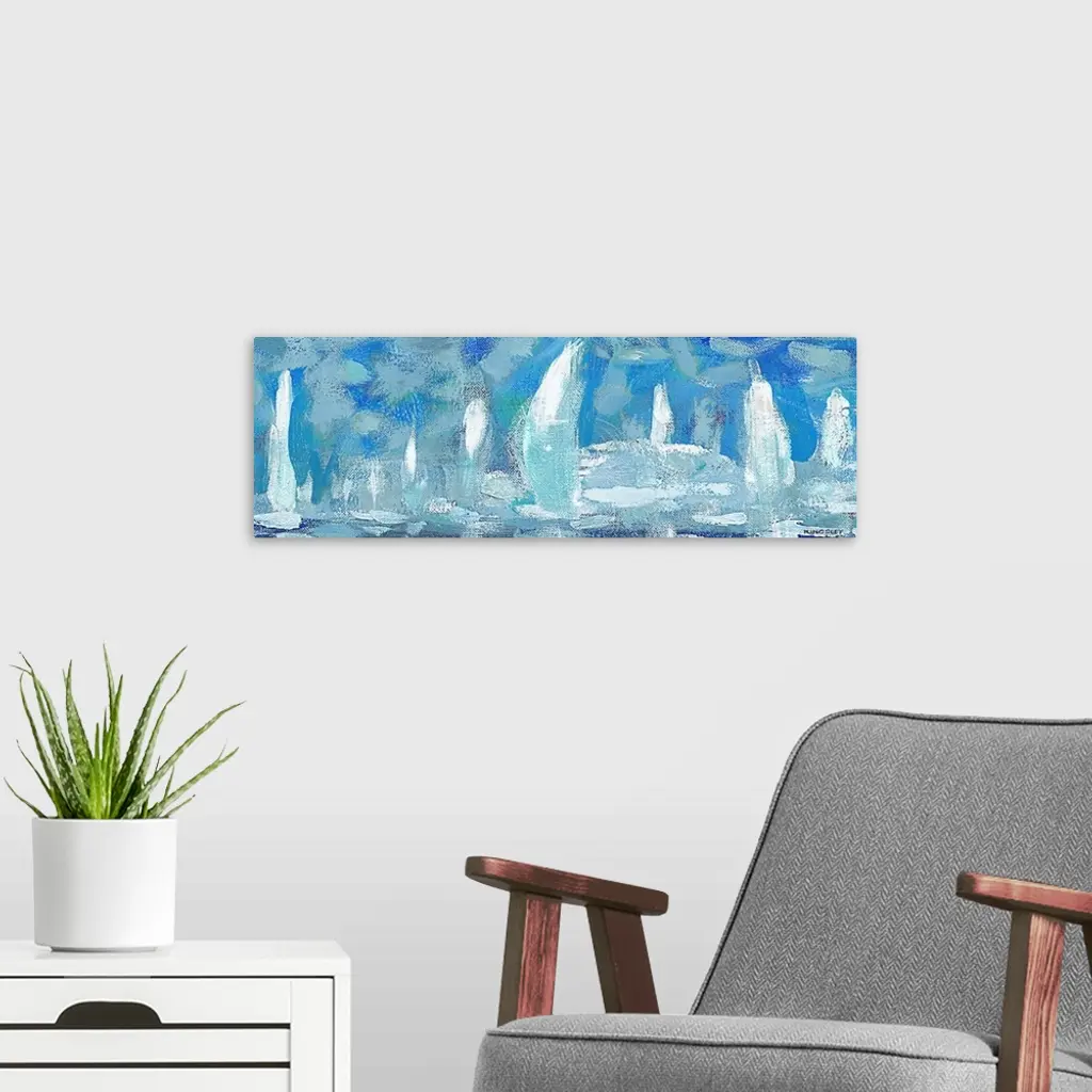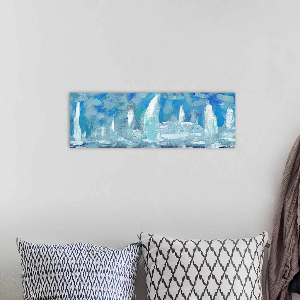 Horizontal artwork of a group of white sailboats against a blue sky.