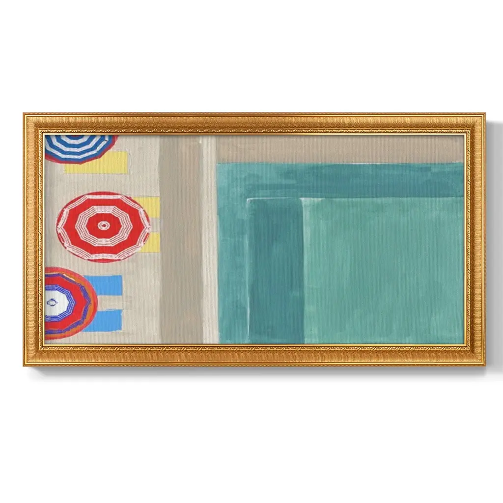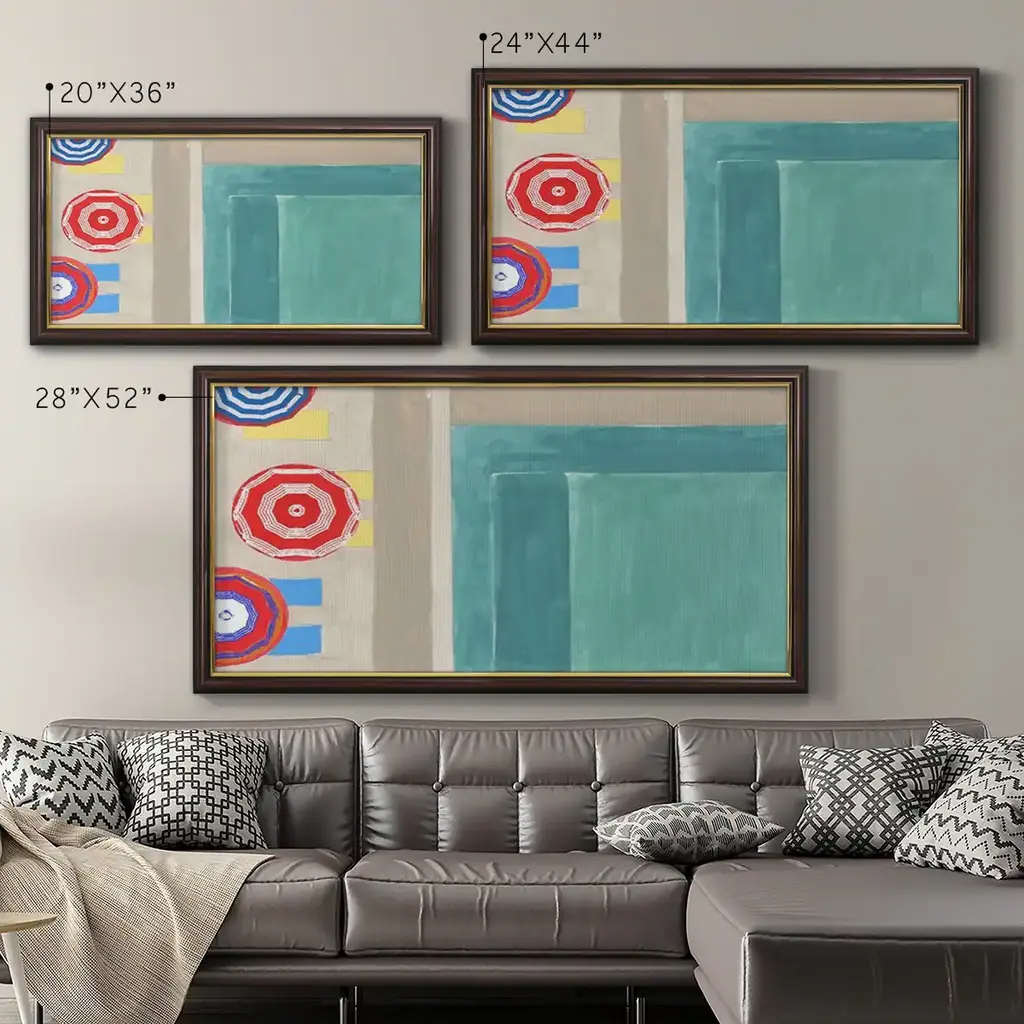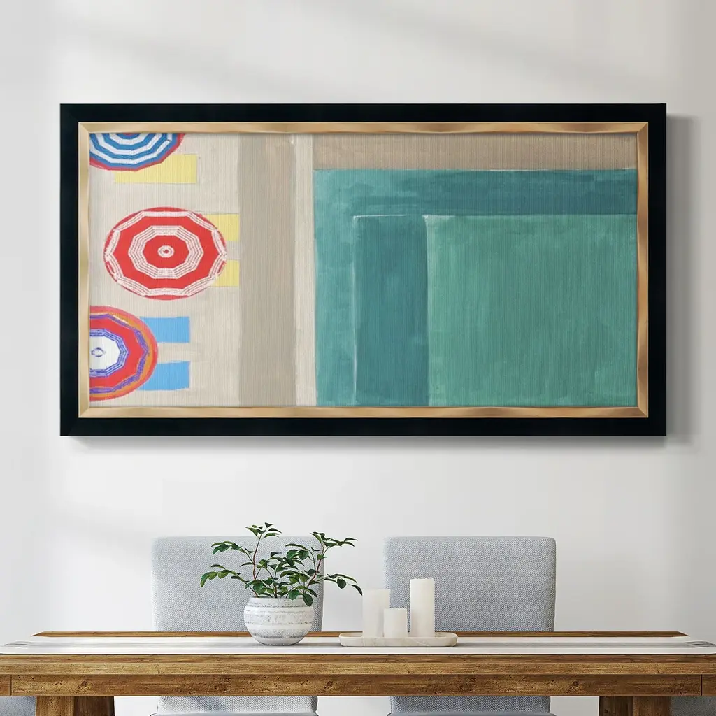 By the Pool I Premium Framed Canvas- Ready to Hang A Premium Framed Canvas created to last. Framed in distressed wood and available in an array of sizes and colors Featuring a beveled a solid wood stretcher bar, each piece comes ready to hand 3 SIZES AVAILABLE 21''X37'' - Overall Size 25''X45'' - Overall Size 29''x53'' - Overall Size Each piece is made to order. Each piece comes with hanging hardware. Made in the USA Ready to Hang Giclee Paper Print Acrylic Glass Beveled Matt Board