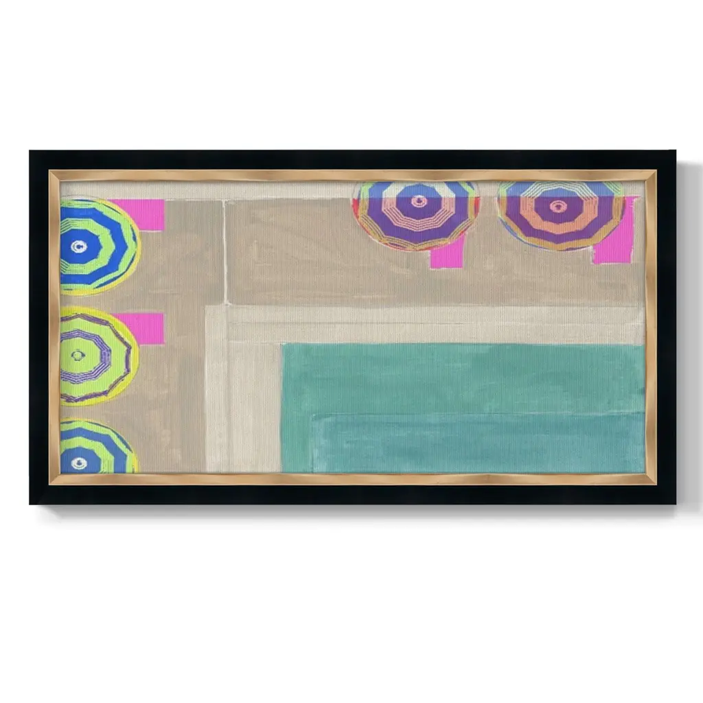 By the Pool III Premium Framed Canvas- Ready to Hang A Premium Framed Canvas created to last. Framed in distressed wood and available in an array of sizes and colors Featuring a beveled a solid wood stretcher bar, each piece comes ready to hand 3 SIZES AVAILABLE 21''X37'' - Overall Size 25''X45'' - Overall Size 29''x53'' - Overall Size Each piece is made to order. Each piece comes with hanging hardware. Made in the USA Ready to Hang Giclee Paper Print Acrylic Glass Beveled Matt Board