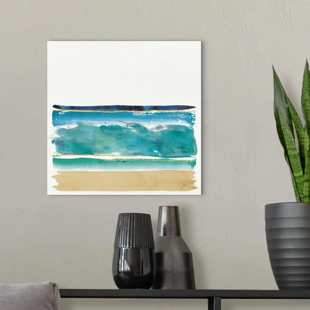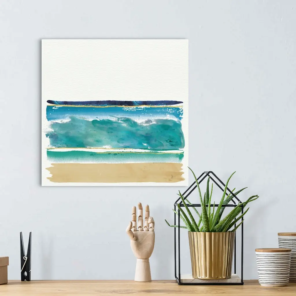 Watercolor painting of the ocean and sandy beach.