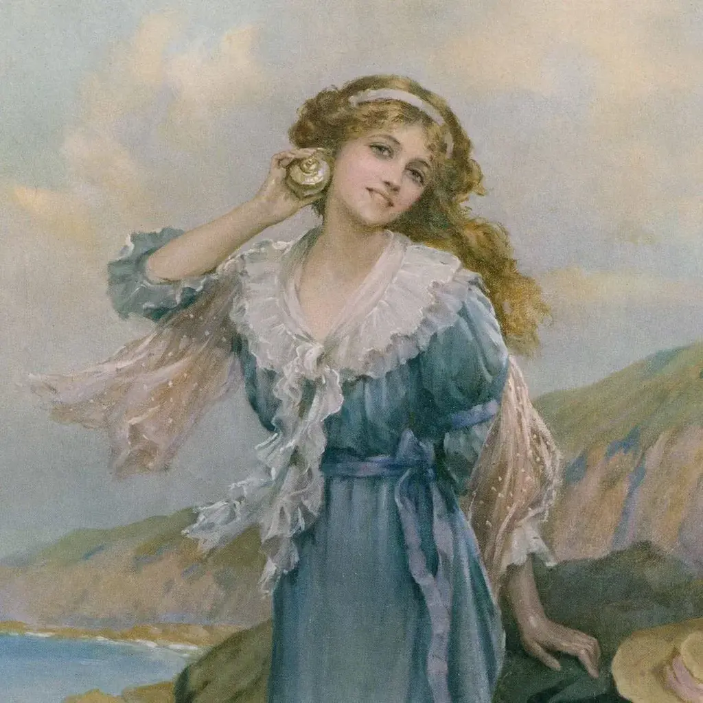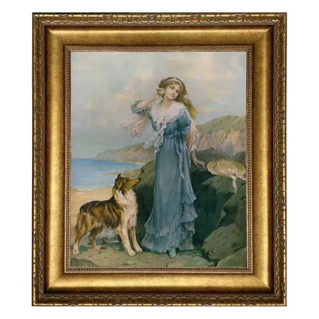 Stunning reproduction print of a Victorian woman and her collie at the seaside. Artist is unknown. Each high-resolution image is printed with archival quality ink on matte canvas, board-mounted, then treated with a special varnish to give it a more authentic oil painting look. Each work is custom framed in a wide antiqued gold resin frame, and the back is finished with craft paper and a saw tooth hook or wire hanger. • Painting print: 16" x 20" • Finished frame size: 22" x 26" • Frame width: 3-1/4" • Frame thickness: 2" • Wire hanger