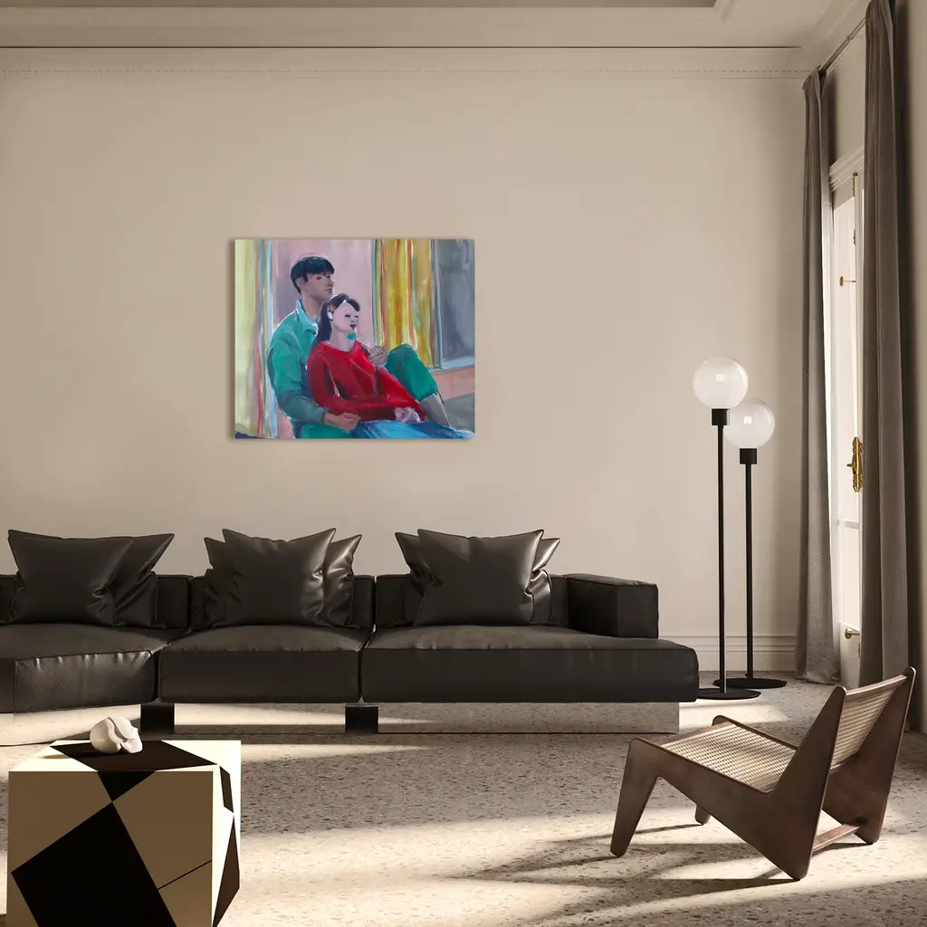 Depicting a young man peacefully sitting on the floor, back against the wall, gently embracing a young female soul, this stupendous painting by Milena Sgambato explores human relations and the ability to reveal one's inner self. Part of the "By the river" series of unique paintings, please contact the Concierge for further information. This is a unique piece of art. Delivered with a certificate of authenticity. Frame not included.