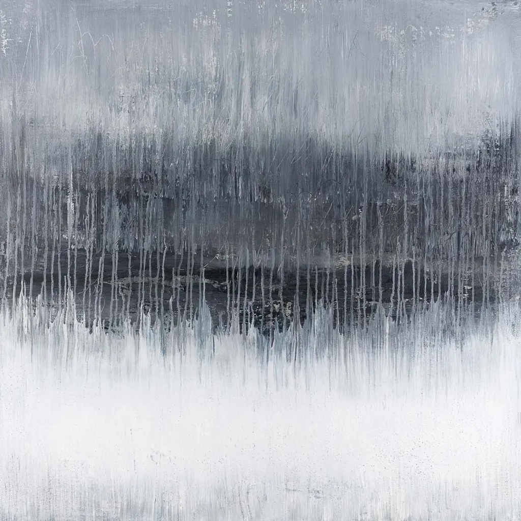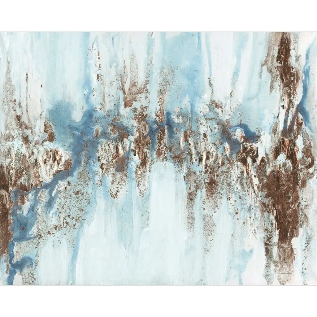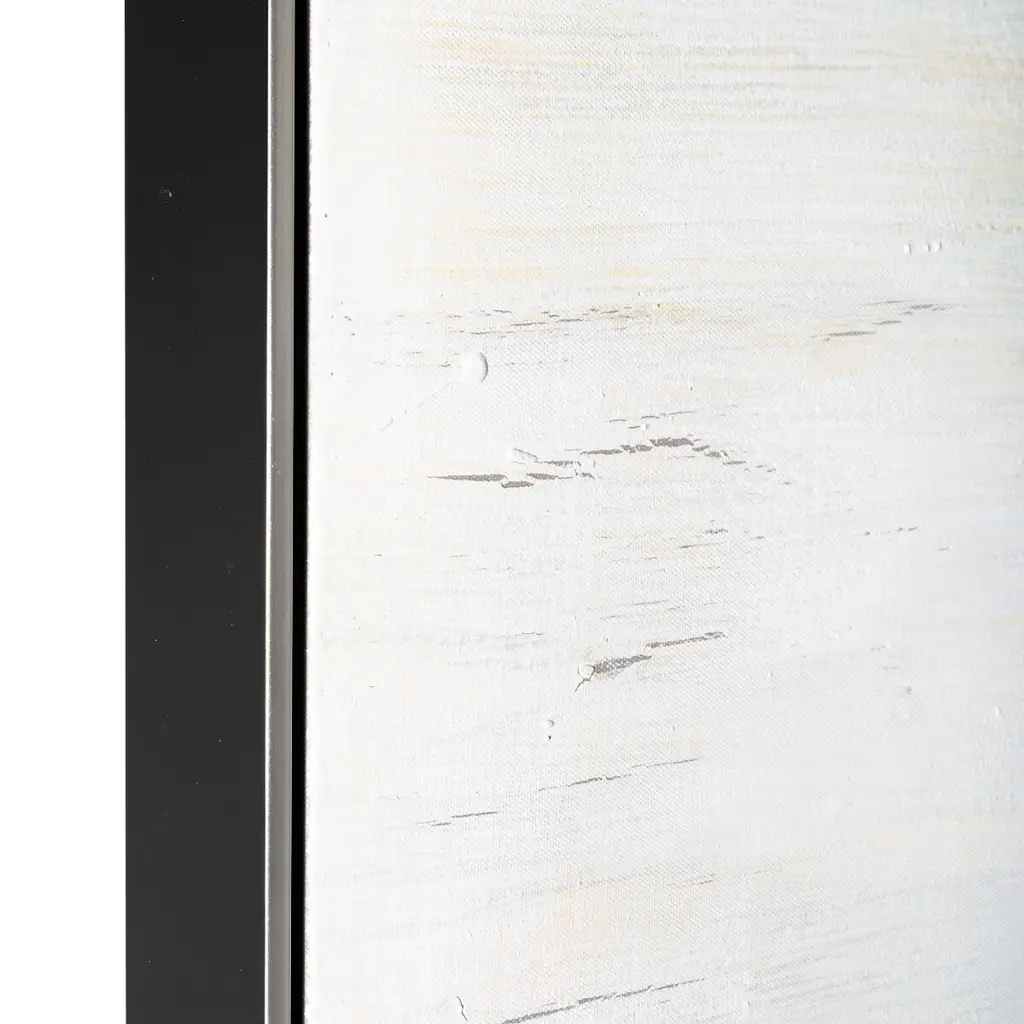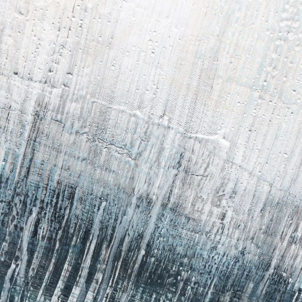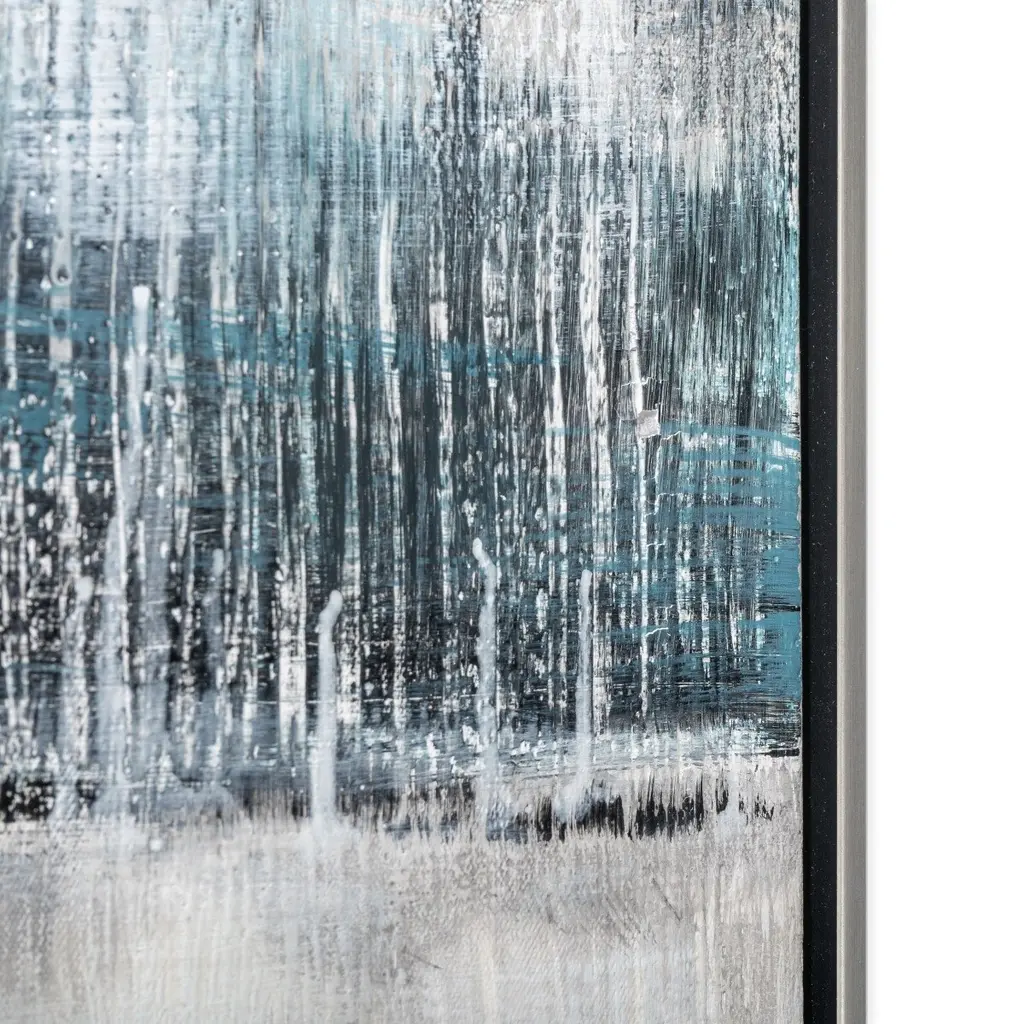 Captivating in its unique distinction, this abstract featuring coastal hues has a dramatic quality that works in myriad contemporary spaces. Deep blue and white tones mimic a linear horizon. Finished and ready to hang with a black and silver floater frame it is the perfect addition to any bedroom, living room or office space