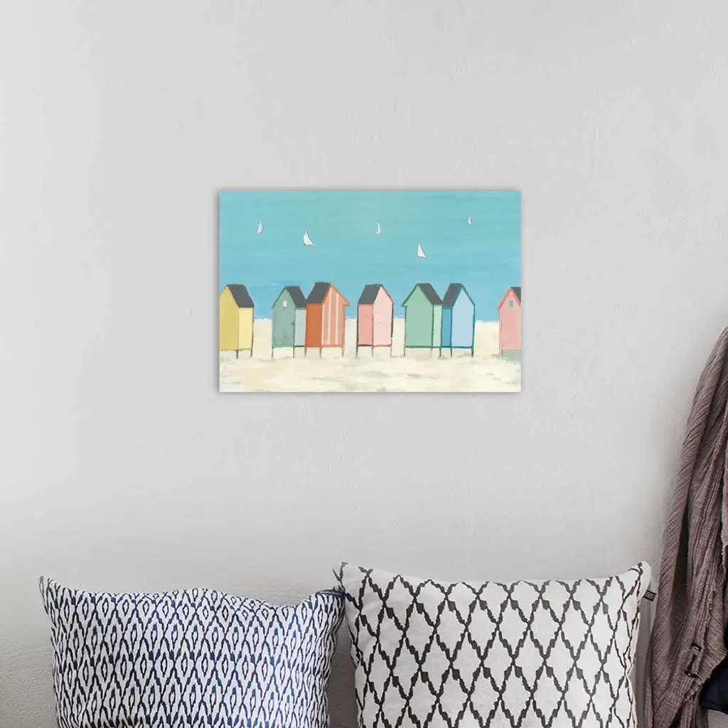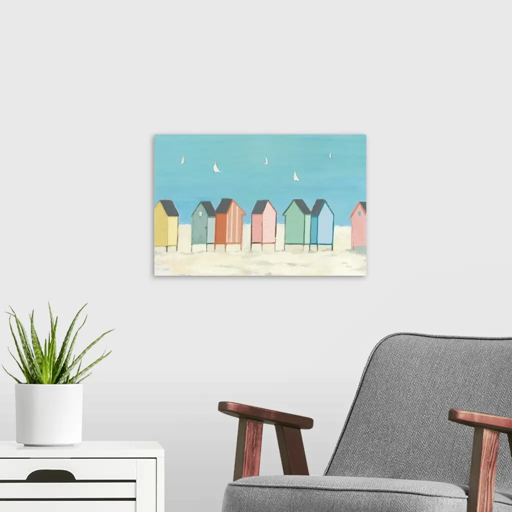 Decorative artwork of colorful sea shacks at the beach with sailboats floating in the distance.