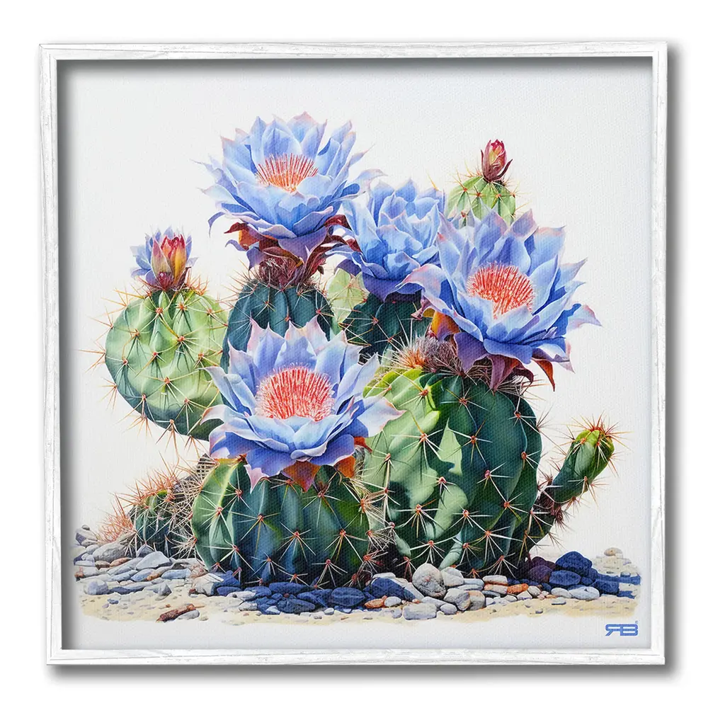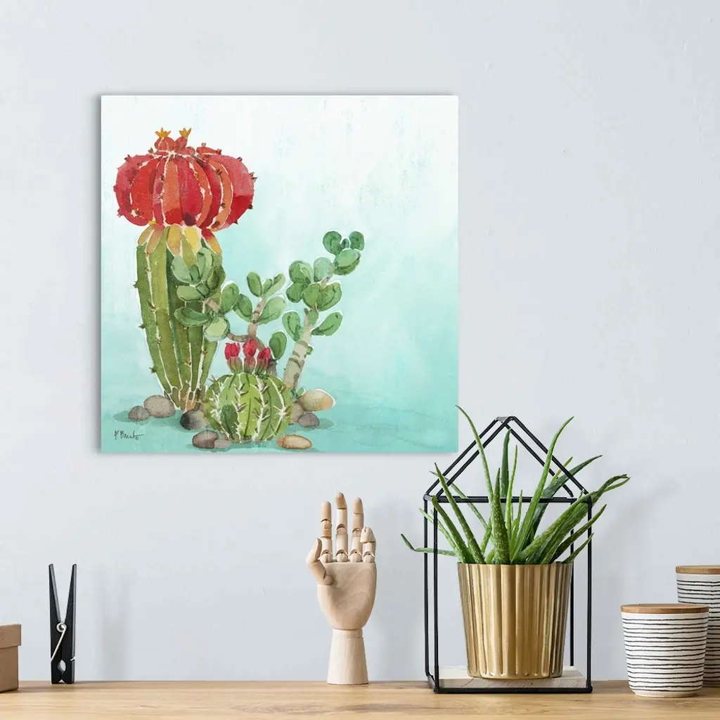 Square watercolor painting of cacti on a light blue and white background.