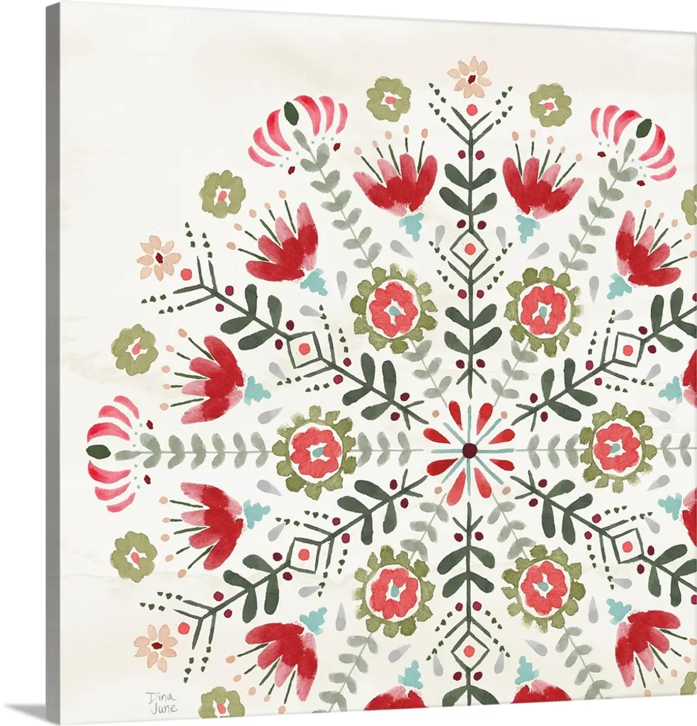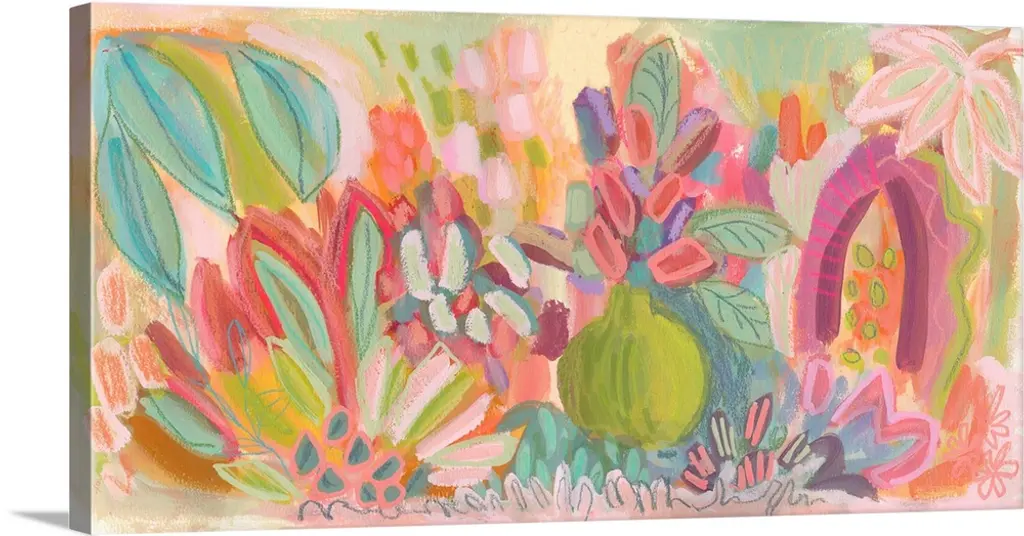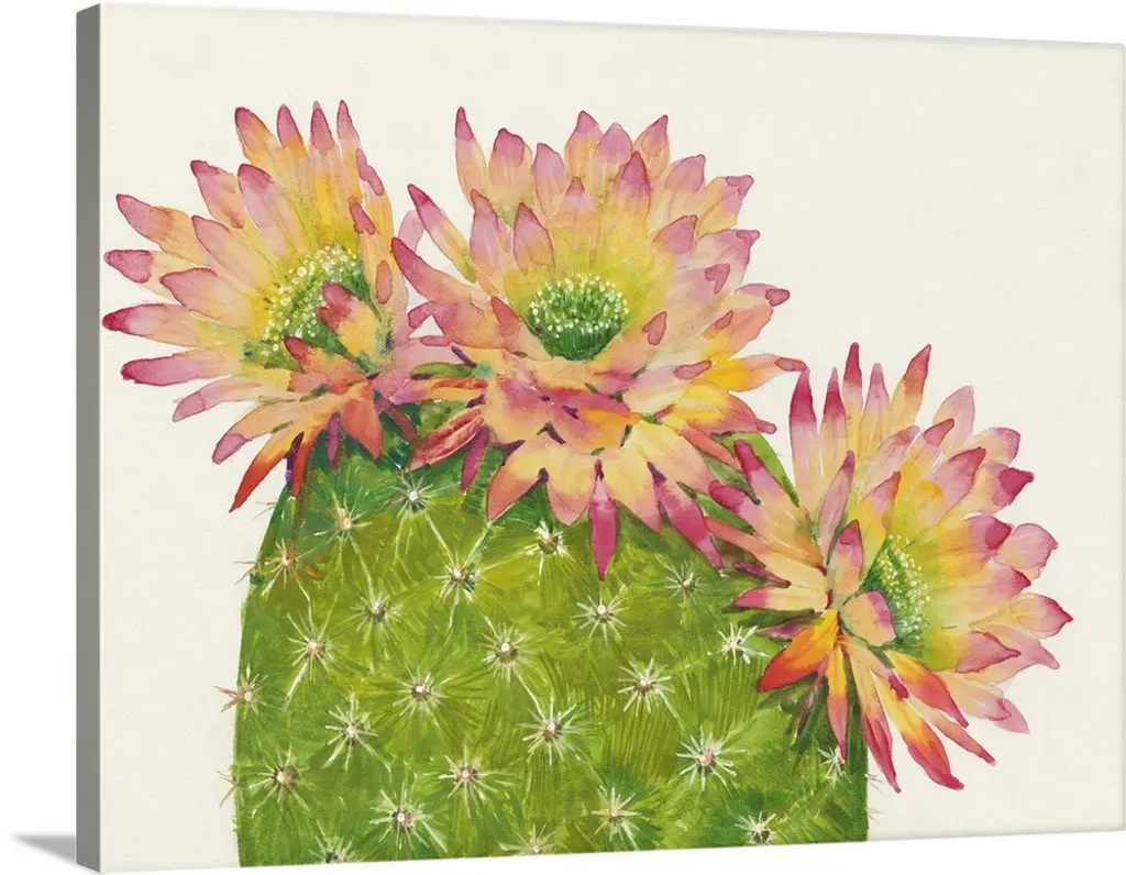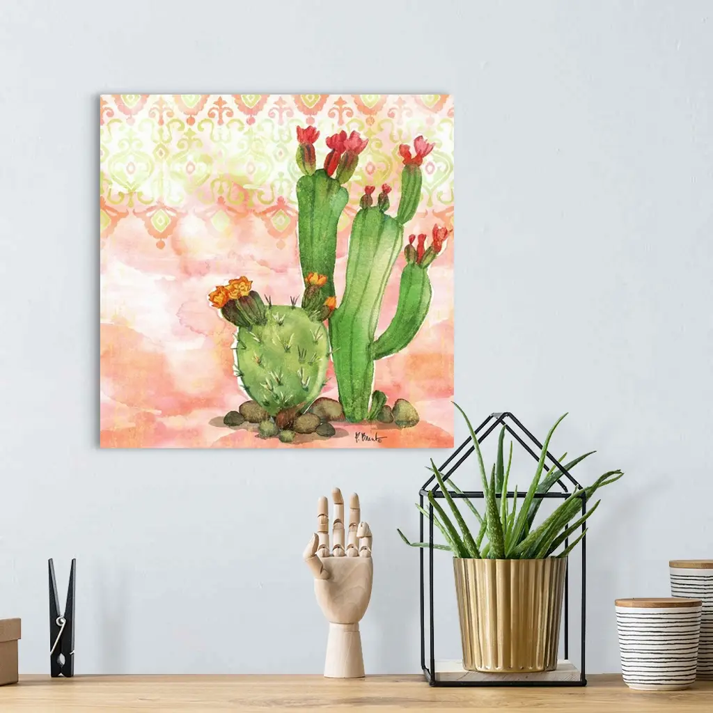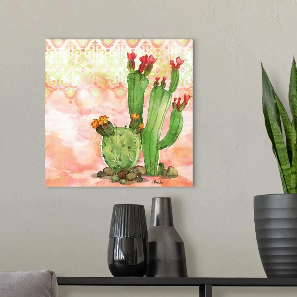 Square watercolor painting of cacti on a light coral and green patterned background.
