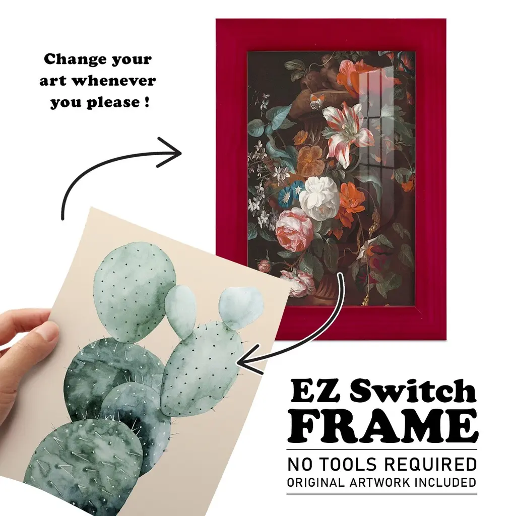 Cactus on Coral I -EZ SWITCH Framed Print w/glass-Cherry Red A delightful, framed print. Featuring a solid wood frame with real wood glass. This premium print is giclee quality. In addition, every frame features a removable back and table top stand. This allows you to change your art in the future or to just stand the art on a table for a new look. We are sure you'll enjoy our new series of EZ SWITCH Framed Art. Solid Wood Frame Real Glass Removable / Replaceable Art Built in Tabletop Stand Sizes range from 4x6 up to 12x15 - buy just one or pair them up as sets as you see fit.