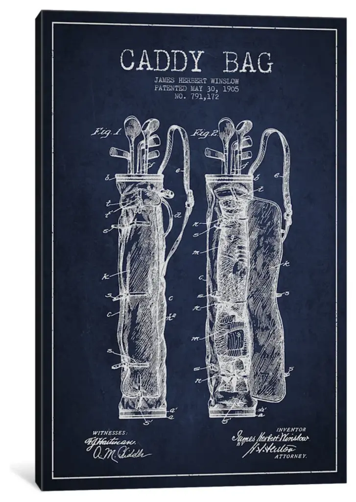"Caddy Bag Navy Blue Patent Blueprint" By Aged Pixel, Canvas Print, 26"x18"
