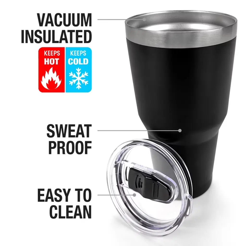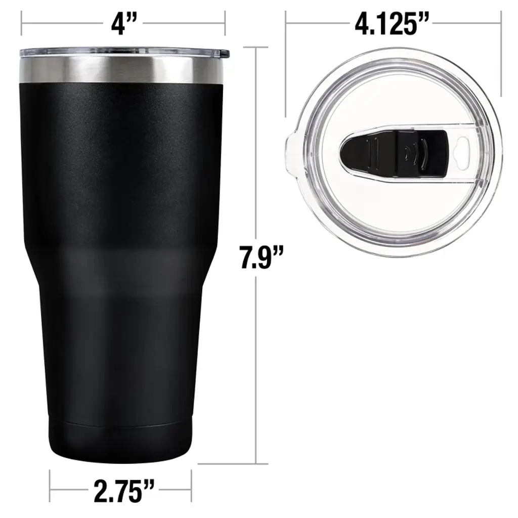 Start strong and stay refreshed with this officially licensed 30 oz stainless steel travel tumbler from Logovision—built for fans with places to go and coffee to drink. Crafted from premium 18/8 food-grade stainless steel and finished with durable powder coating, this high-capacity tumbler features vacuum-insulated, double-wall construction to keep beverages hot for up to 6 hours and cold for up to 12. Its sweatproof design keeps hands dry, and the cool-touch exterior makes it comfortable to carry, no matter what you're sipping. Perfect for long commutes, weekend getaways, or tailgates with friends, this tumbler fits in most standard cup holders and includes a BPA-free dual-flip sliding lid with a secure silicone gasket to prevent leaks. At nearly 8 inches tall, it's sized for serious hydration (or caffeine). Easy to disassemble and hand wash—this design is not dishwasher safe. Each tumbler is printed-on-demand in the USA and showcases officially licensed, hand-drawn artwork from Logovision’s in-house artists. Whether you're powering through your workday or repping your favorite fandom on the go, this 30 oz tumbler delivers style, performance, and personality in one.