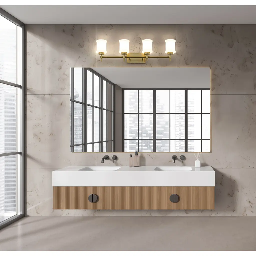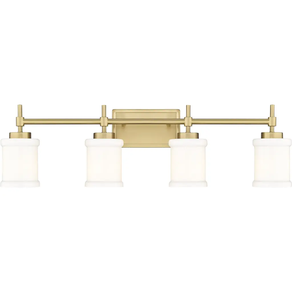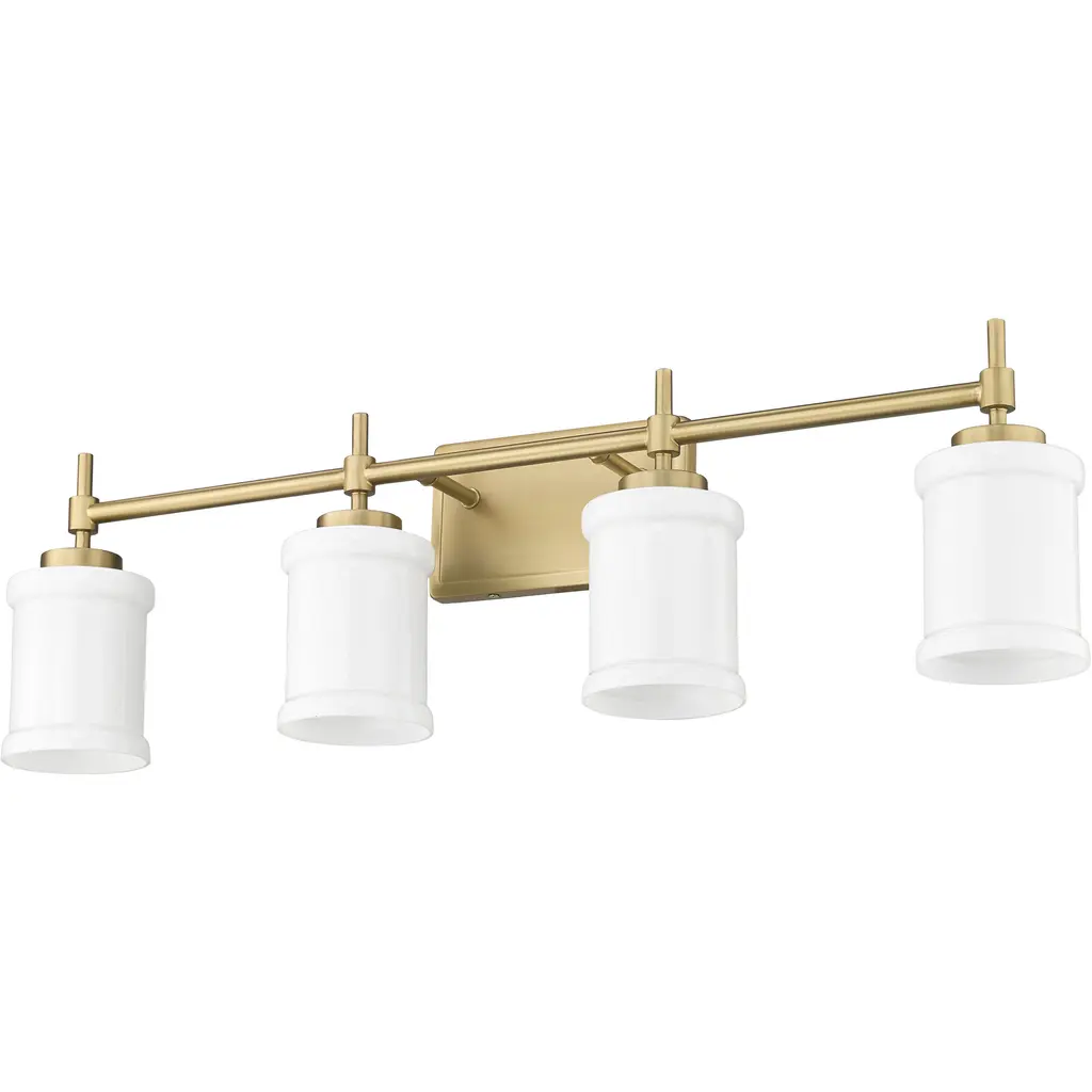 Infuse a sense of warmth and sophistication with a modern four-light vanity fixture. In a modern gold finish that adds glowing allure, the light boasts a trimmed wall plate and decorative arms, offering impeccable dimension and depth over your counter. Glossy white glass cylinders shade each light, enhanced with cuffs that add a perfect dose of dimensionality.
