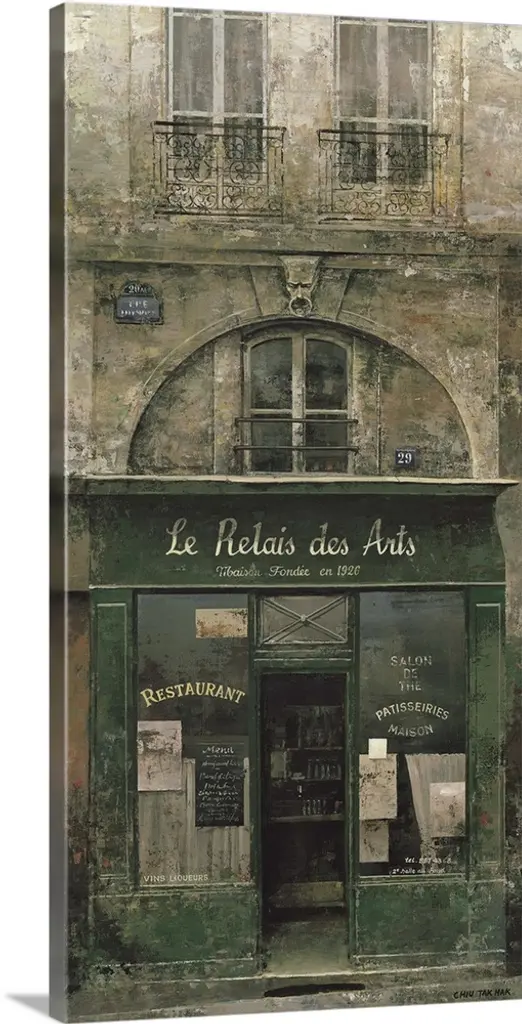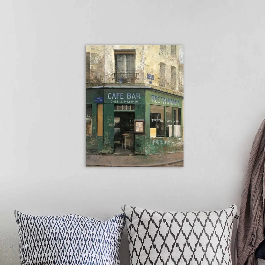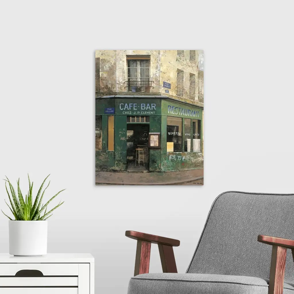 Contemporary painting of a cafe and bar storefront downtown in a city.