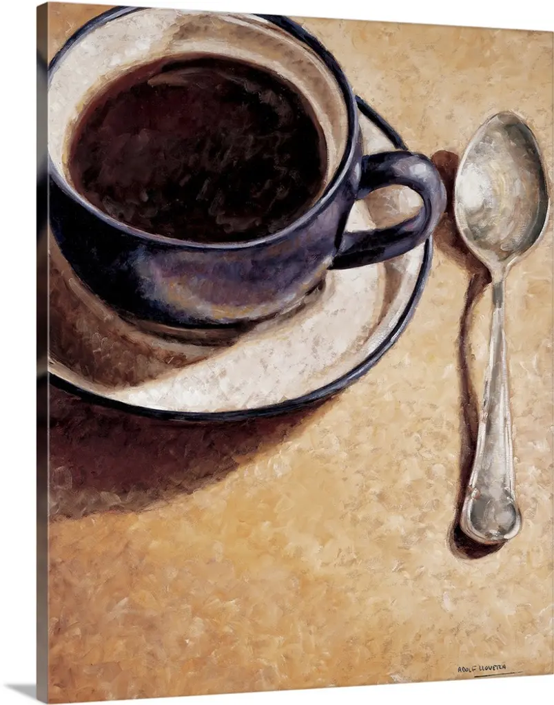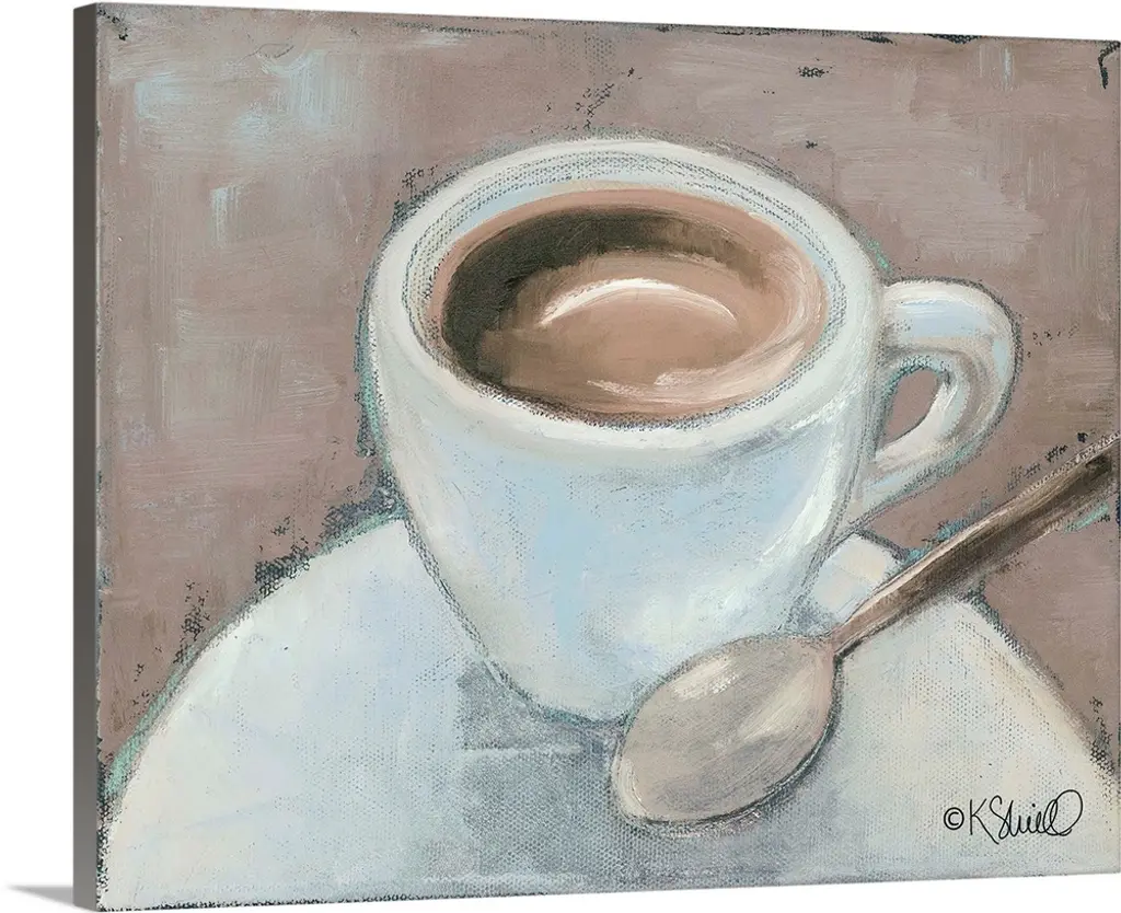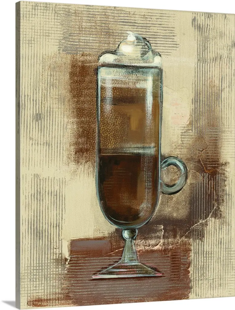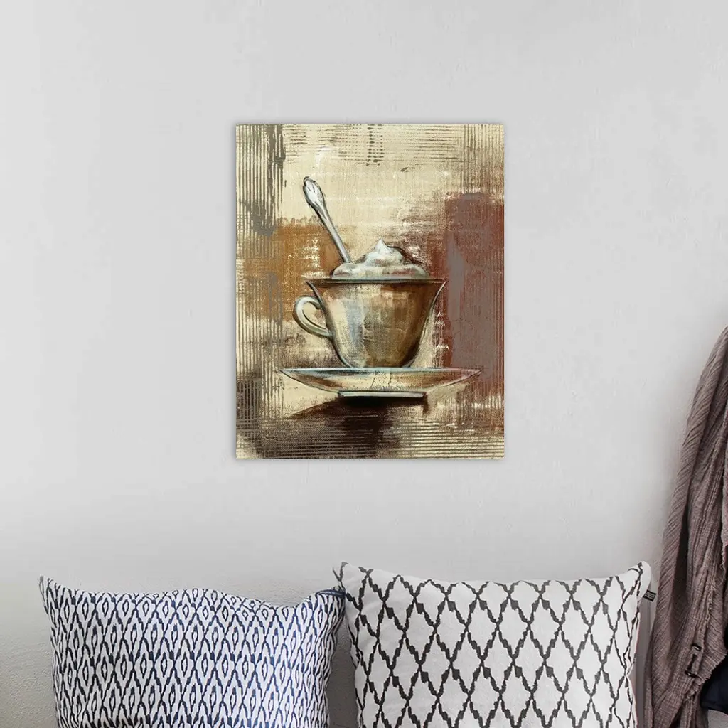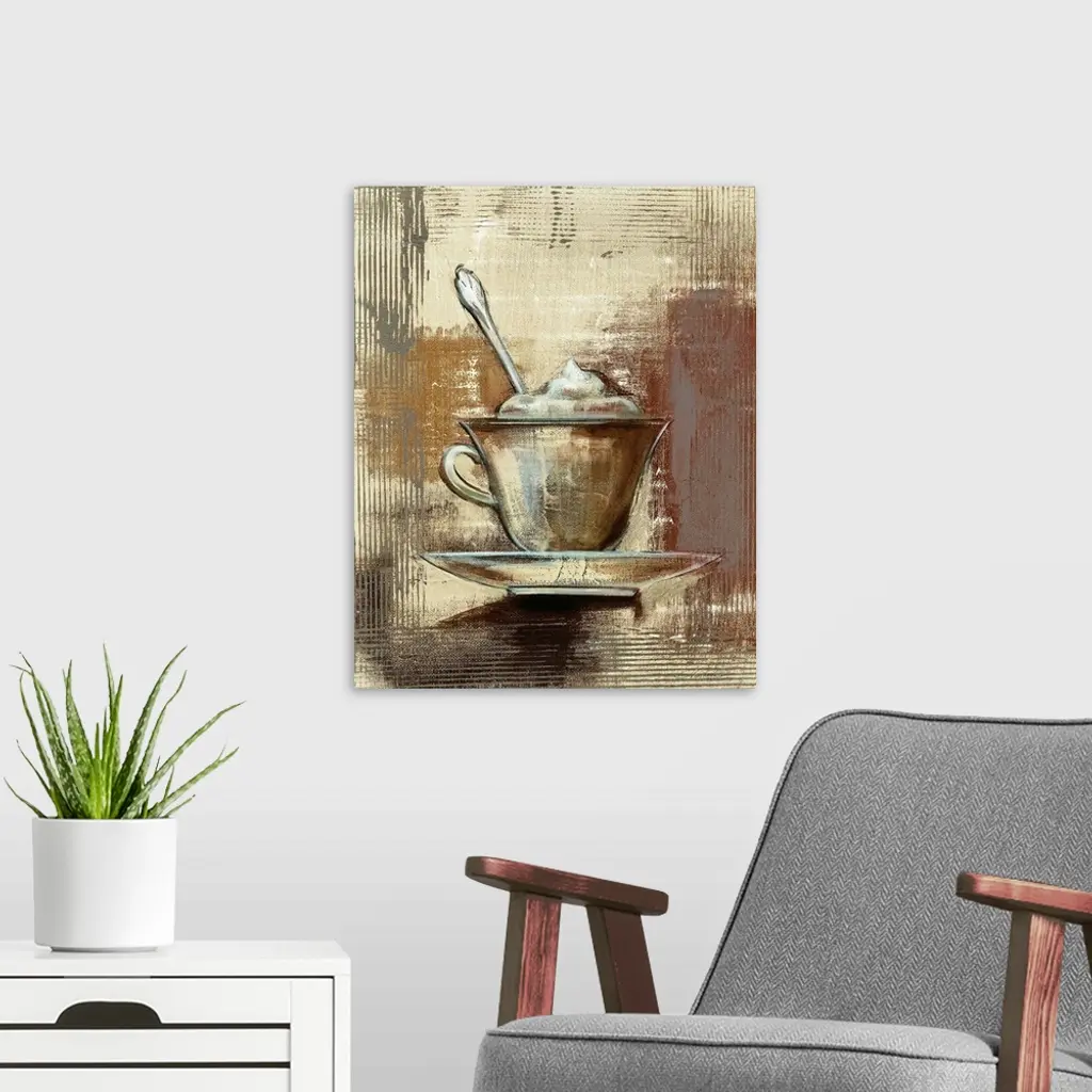Contemporary painting of a cup of coffee with whipped cream on top on a textured neutral colored background.