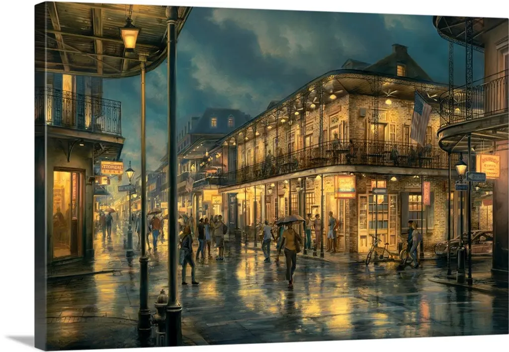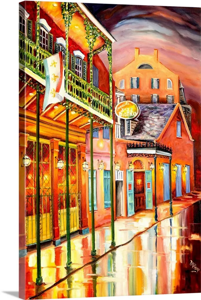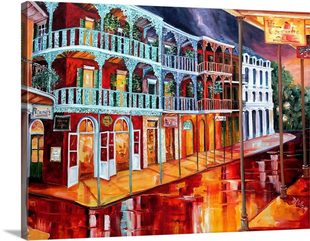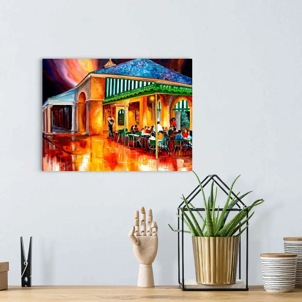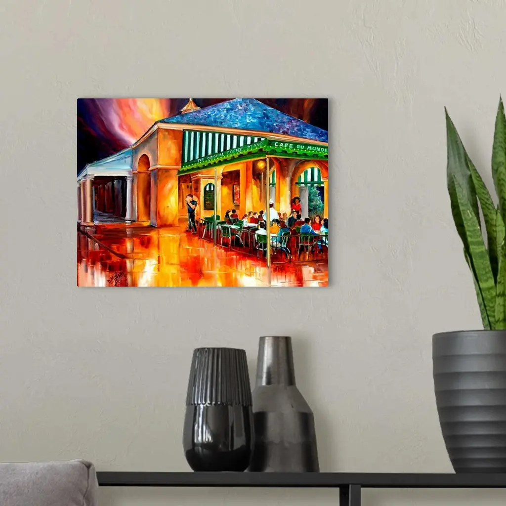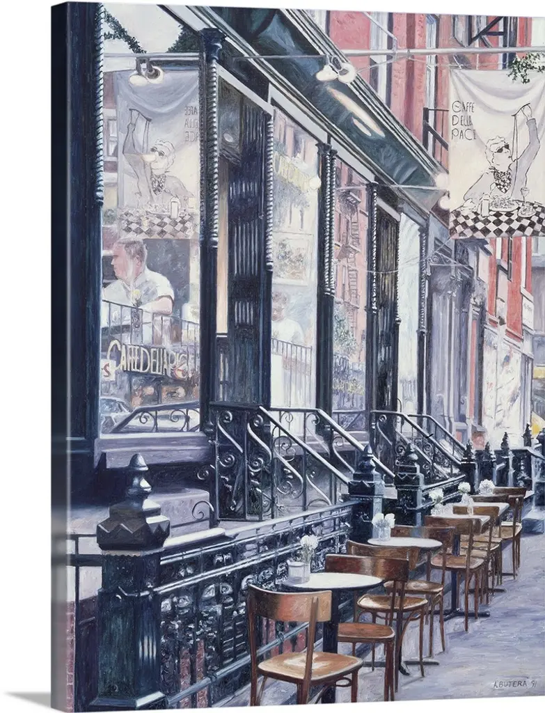 Large painting on canvas of a warm toned cafo with people sitting outside conversing and eating.