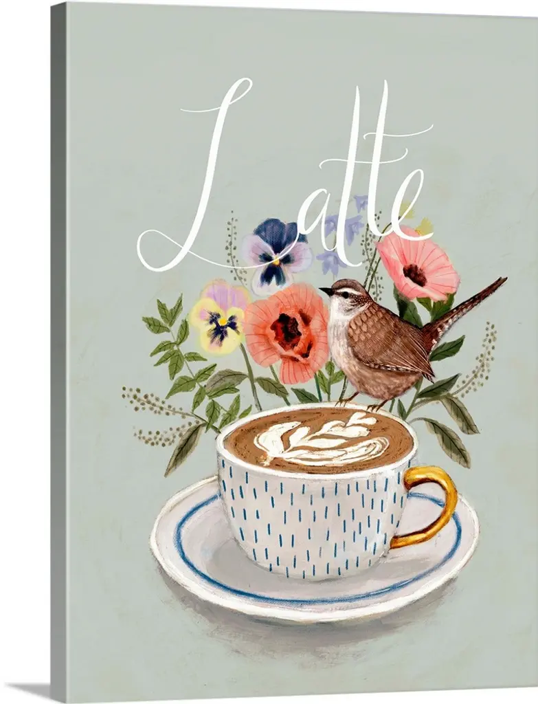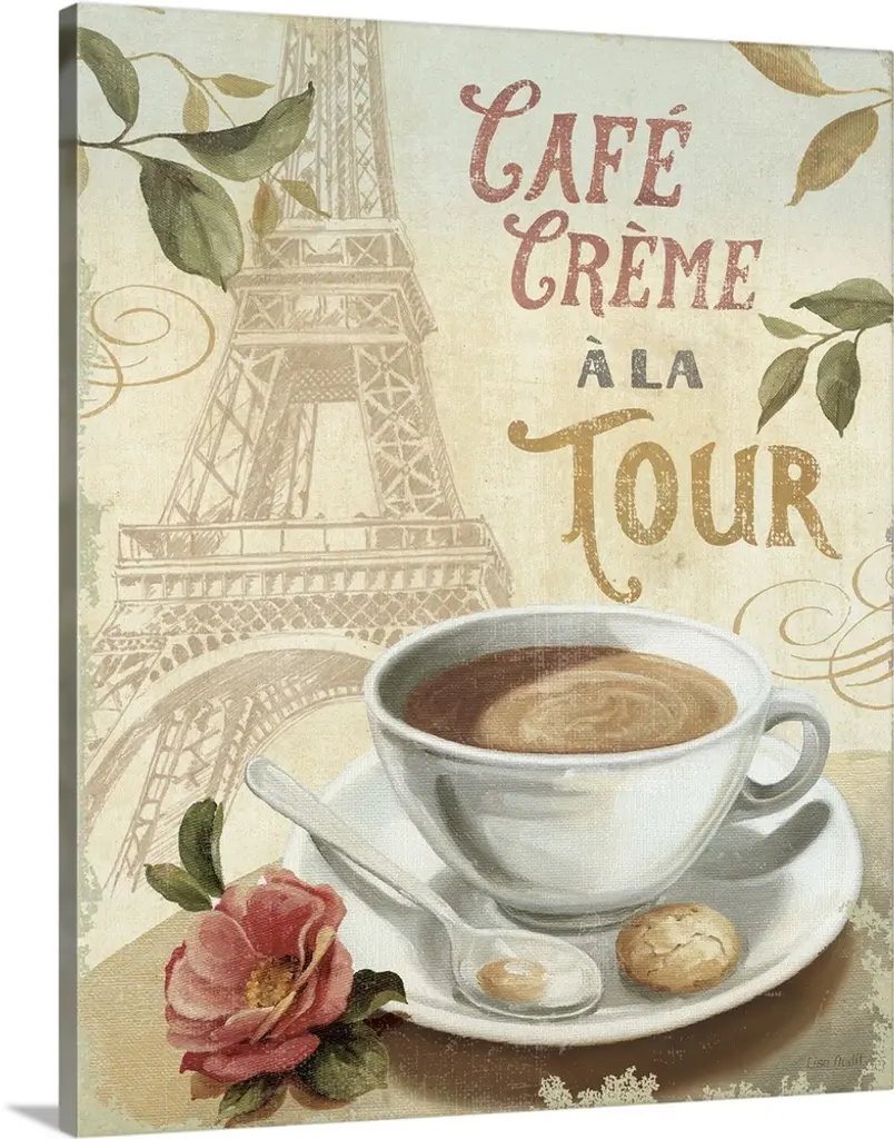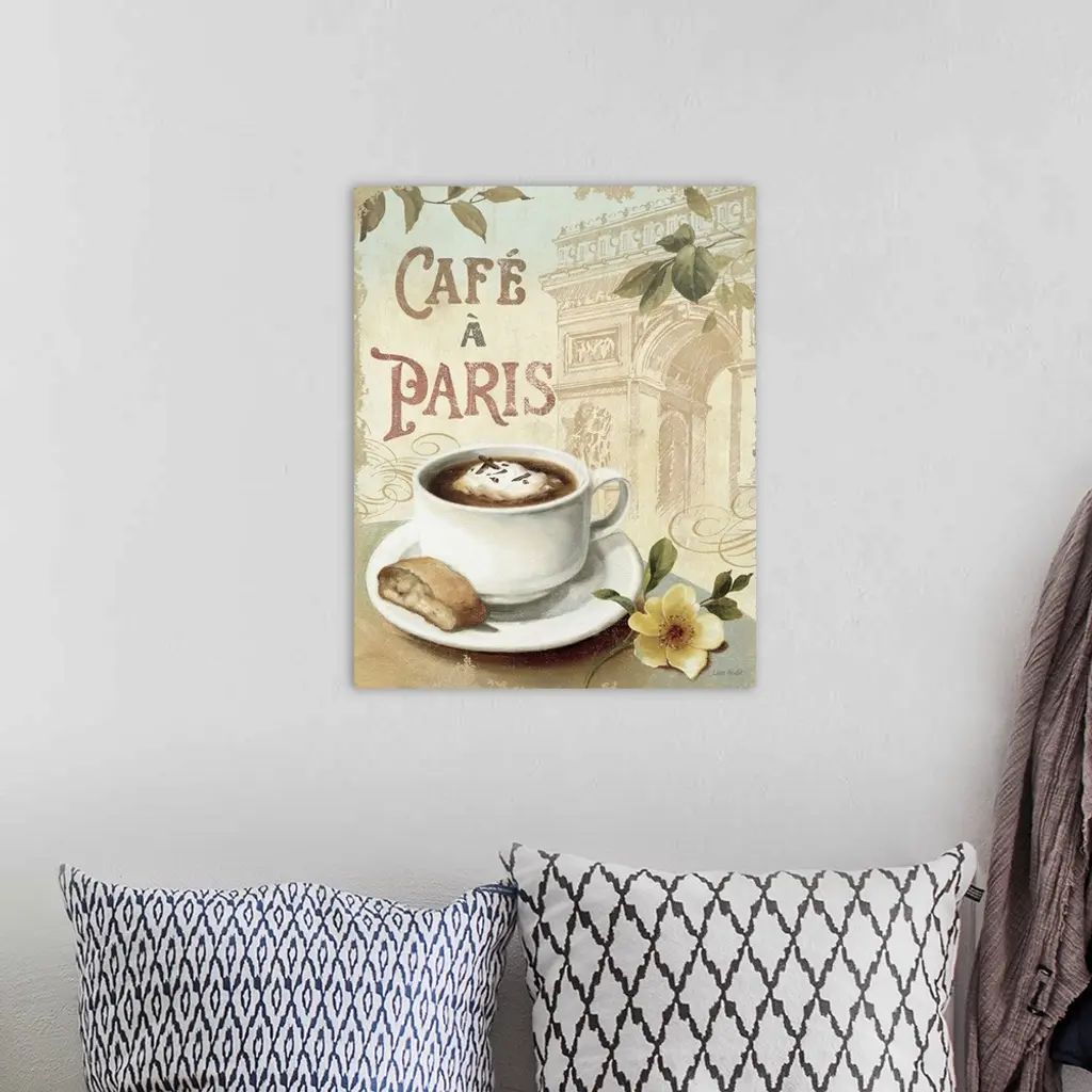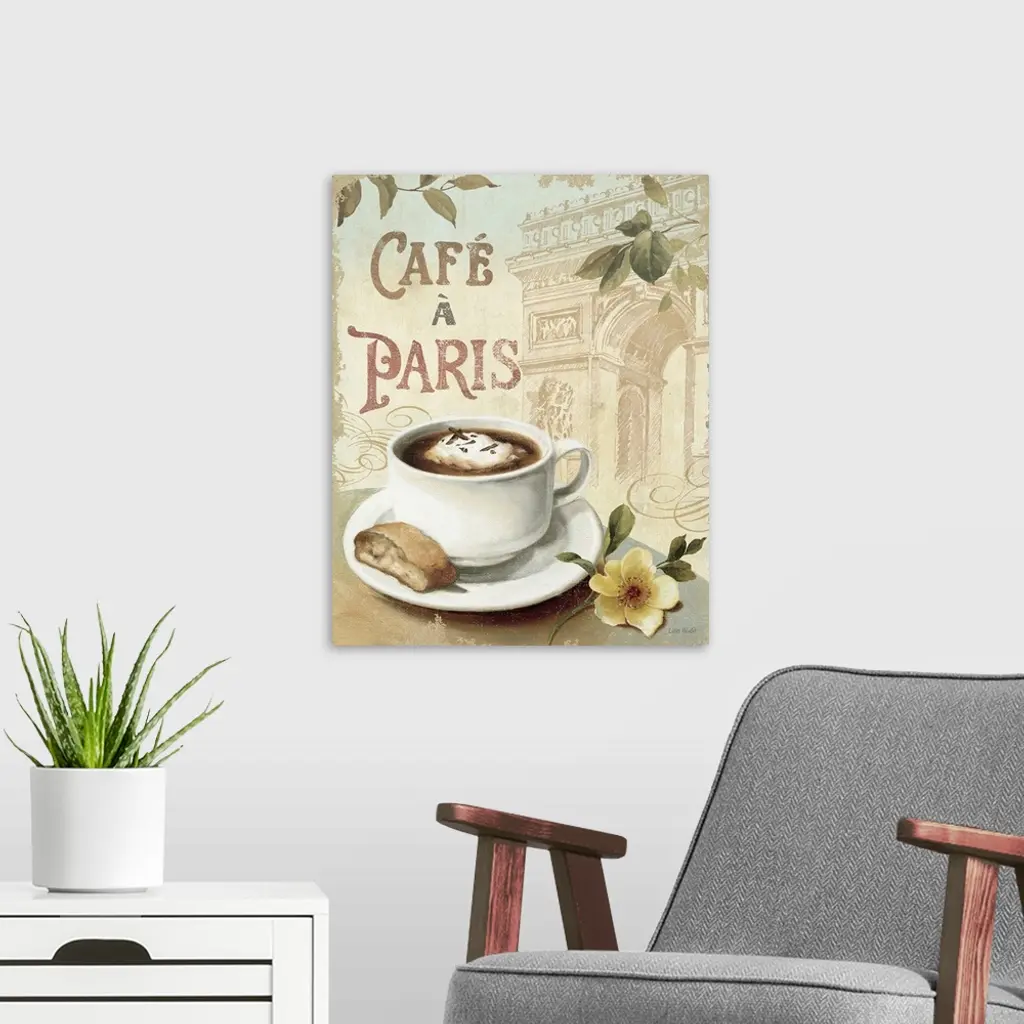 A painting of a cup of coffee on a saucer with a biscuit and a flower over an illustration of the Arc de Triomphe in Paris.