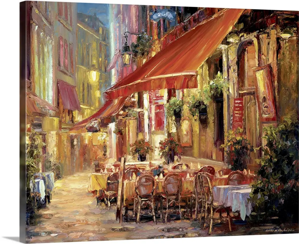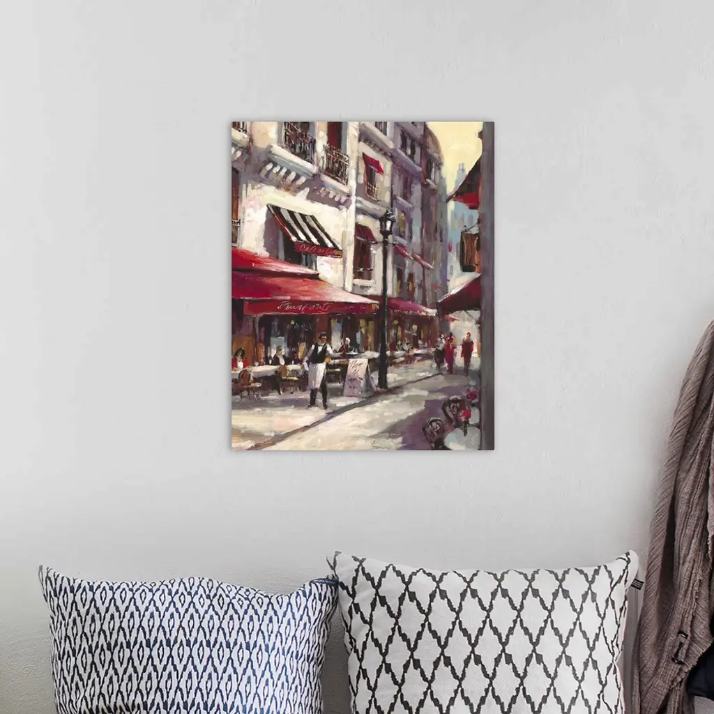 Contemporary painting of a city street with a waiter standing outside a cafe.