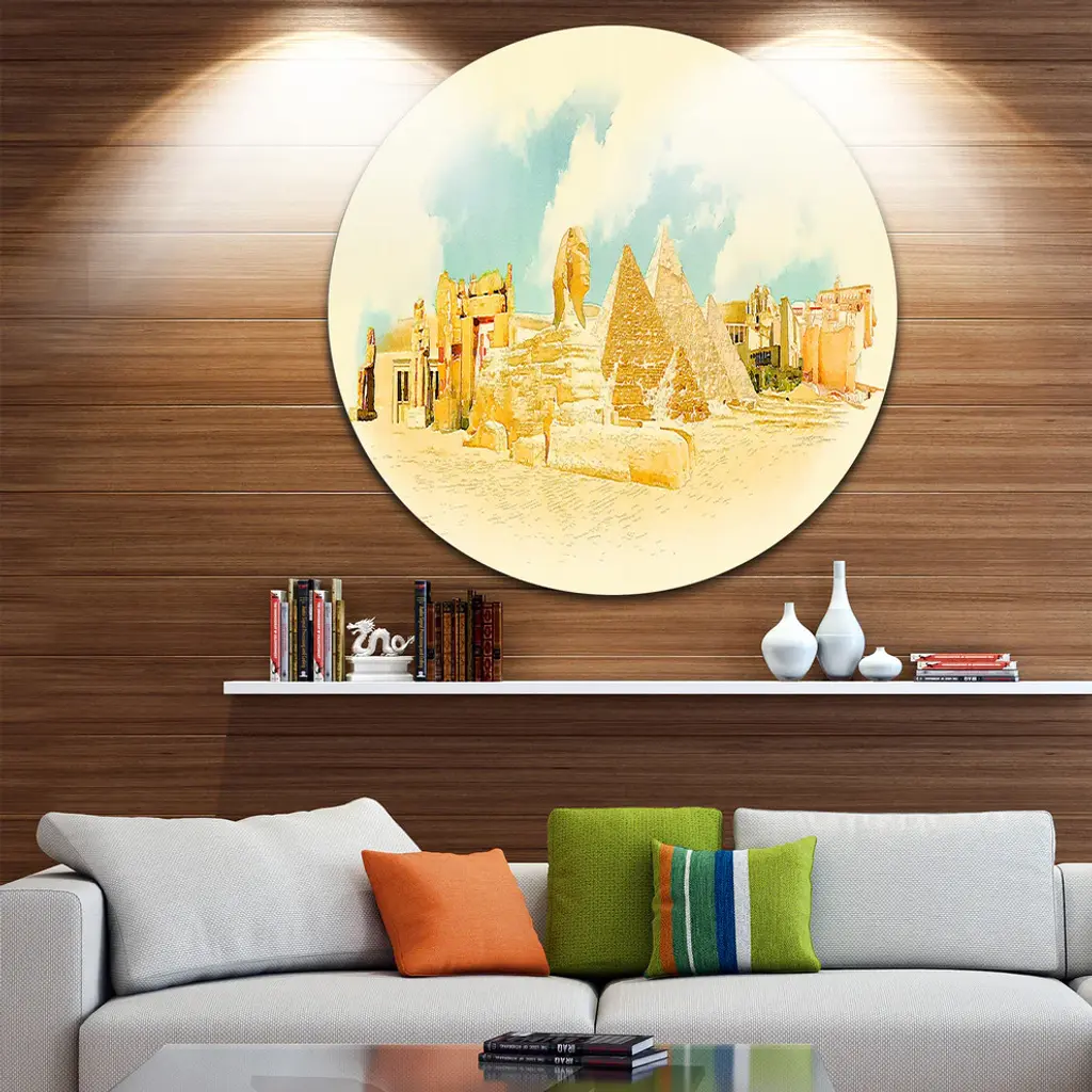 Bring Contemporary Abstraction to your home with this large Circle Metal wall art. This Cairo Panoramic View Metal Artwork makes it the focal point of any room or office. - White Gloss Coating ensures colors are extra vibrant with light reflection.- Aluminum grade Sheet Metal with 1 inch mounting frame on the back giving the illusion that the artwork is floating on the wall..- Mounting Brackets are included along with instructions.- High Quality Digital images are created directly into a glossy aluminum panel producing a stunning and captivating print into the glossy finish of the metal.- Water, Fire and Scratch resistant HD Aluminum panels.- Looks better than any photo paper and guaranteed to last at least 20 years- Easy to clean with a microfiber cloth. Colors are far superior to regular Canvas Art. - Easy to Hang