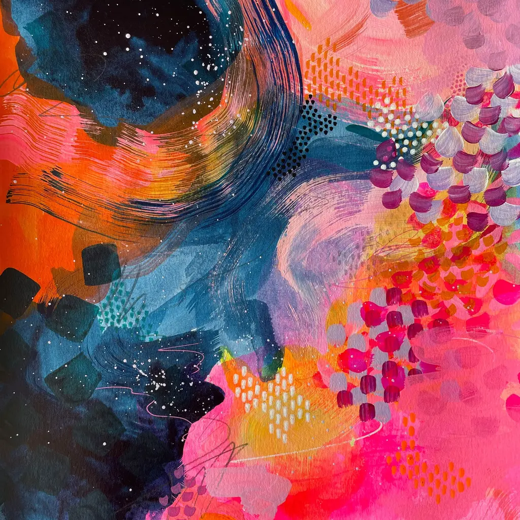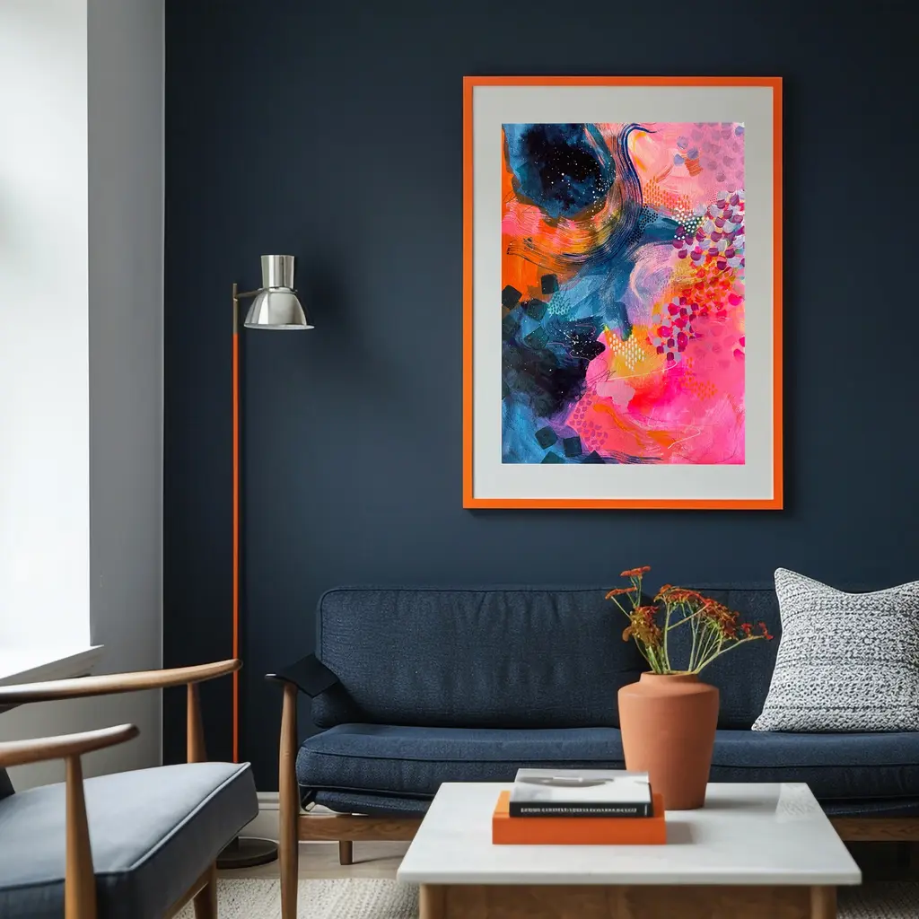 This vibrant contemporary abstract print features beautiful hot pinks, tangerine oranges and blues of teals and cobalts to create a joyful and uplifting piece of art for any interior. Originally painted using acrylic paint, inks, oil pastels and pencil, this luxurious-quality fine art print beautifully captures every brushstroke and hand-crafted mark. Printed on heavyweight 316gsm cotton rag textured paper using archival-quality inks, this A2 giclée print will maintain its beautiful vibrancy for many years to come. Each print has a white border so it can easily fit into a standard-size frame. Print is sold unframed.