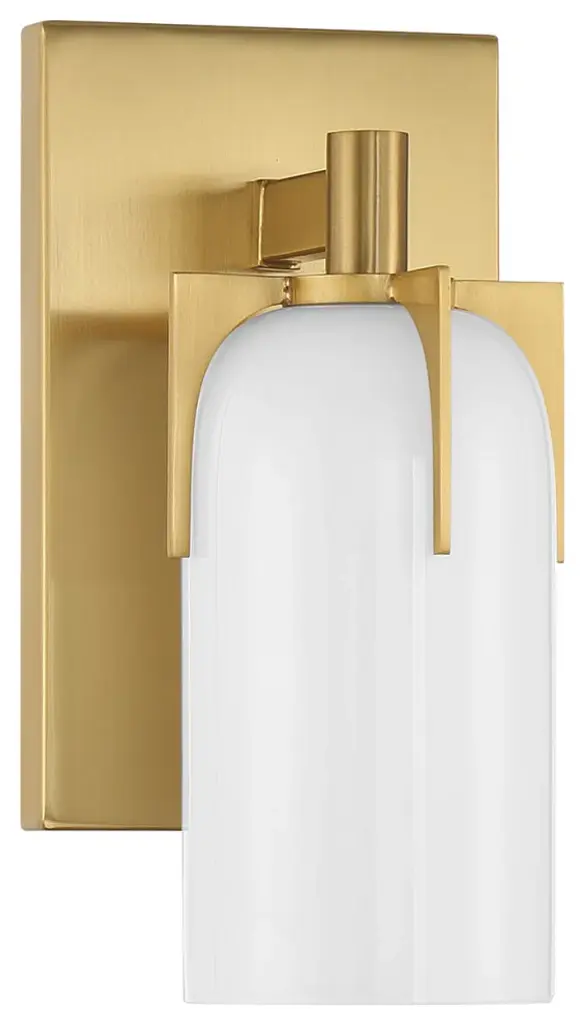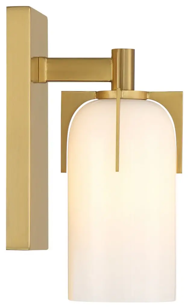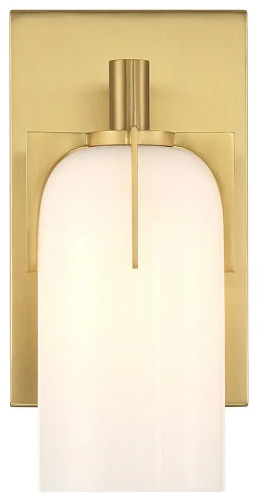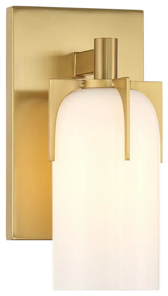 Bring fashionable, vintage-inspired lighting home with the Savoy House Caldwell 1-light sconce. An etched white opal glass shade is held in place with dramatic jewelry-like prongs that are finished in Warm Brass. Caldwell is 9.5" in height, 4.75" in width and extends 5.5" from the wall. It uses one candelabra size bulb of up to 60 watts. The bulb is not included. This sconce is damp area rated and must be installed as shown.