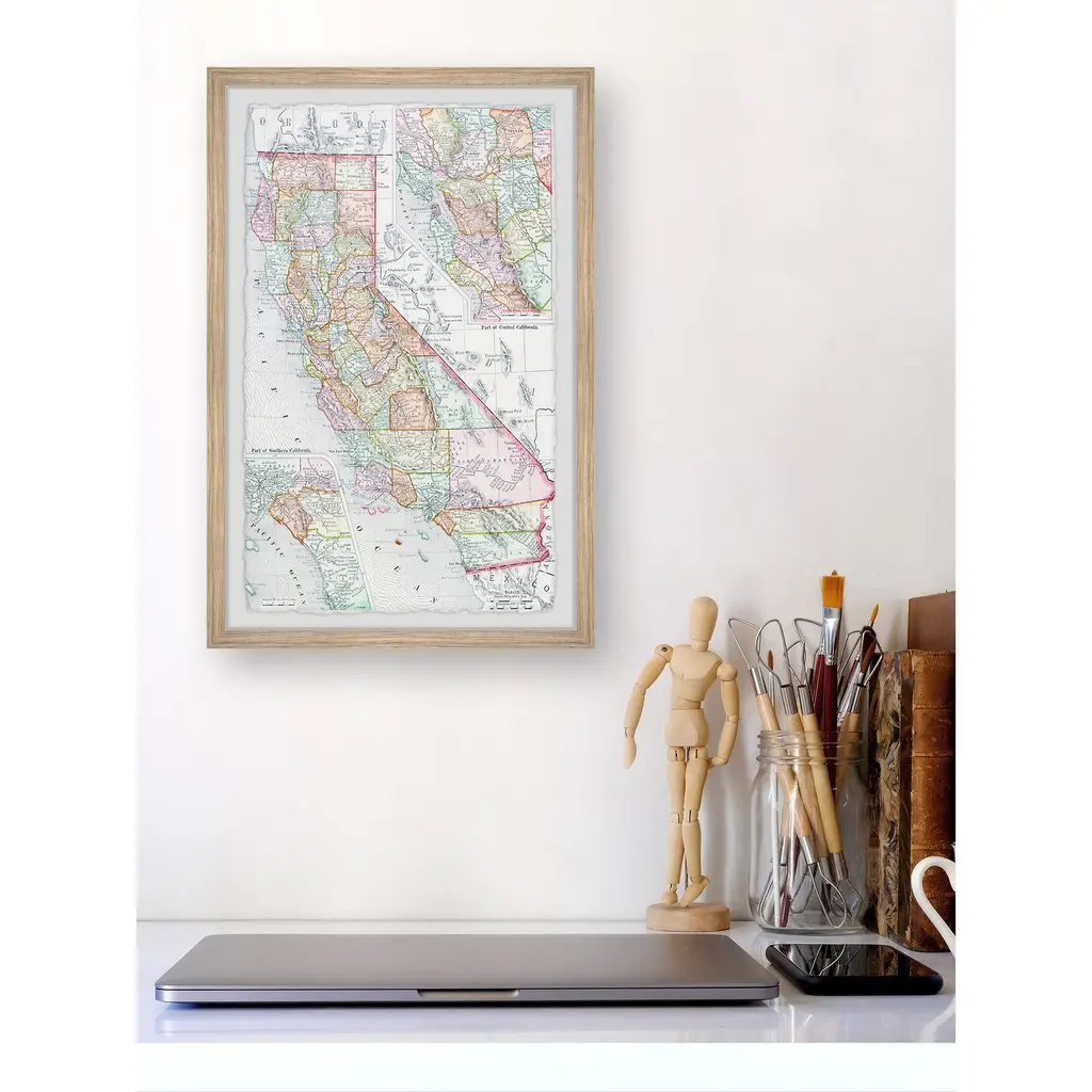 Travel back to the West coast with this detailed map of California's shoreline and the state's most iconic spots. This piece is printed on high quality archive paper and professionally hand-framed. With wall-mounting hooks included, this artful accent is ready to hang up as soon as it reaches your front door. • Top quality Giclee print on high resolution Archive Paper • Hand cut deckled edges • High quality durable non-warping frame • Finished under shatter resistant plexiglass • Arrives ready to hang • Includes a certificate of authenticity • Printed the USA