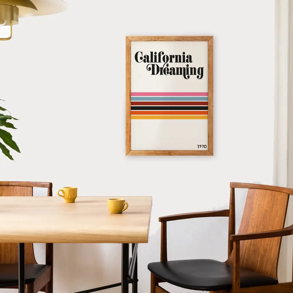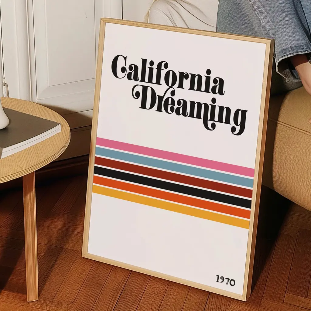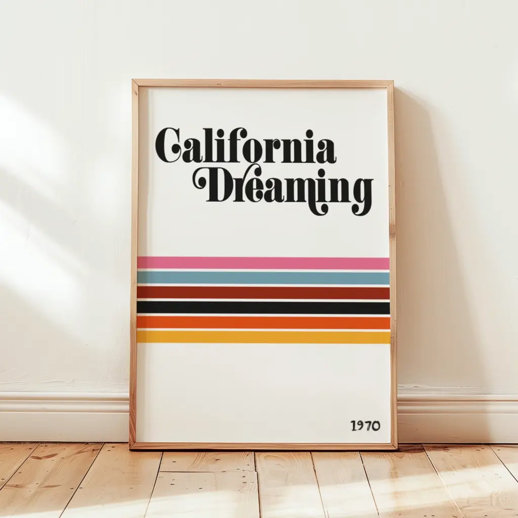 All the leaves are brown and the sky is grey.....We've gone to the west coast to seek the sun and 60s inspiration, Inspired by the legendary song California dreaming by The Mamas and Papas.Our California dreaming print fuses a 1960s/70s Californian colour palette and stripe with the San Francisco folk inspired typography. Taking influence from both the skateboarders and surfers on Venice Beach and the counter culture free spirited movement. Brighten up your walls with this fun and retro art piece. Giclée printed on Munken pure smooth cream paper which is certified by the Rainforest Alliance Program for FSC® Standards.