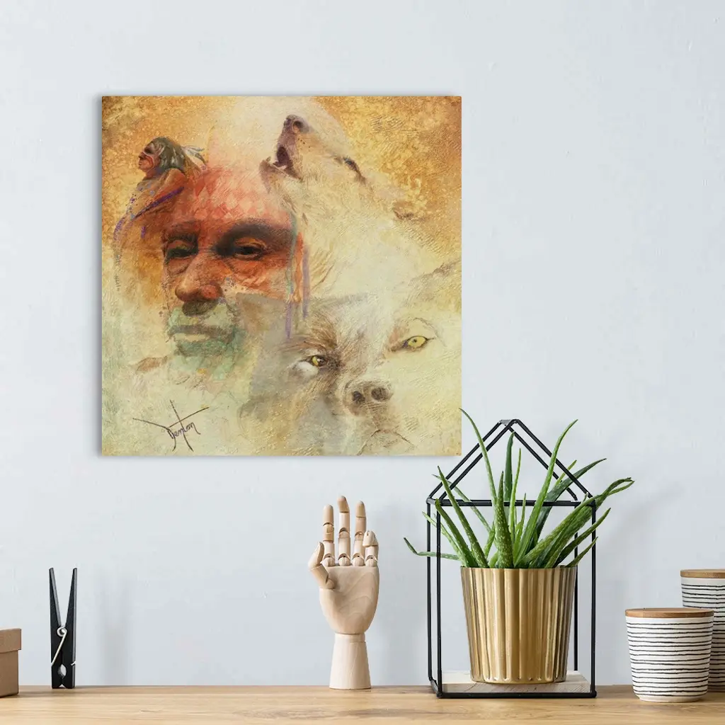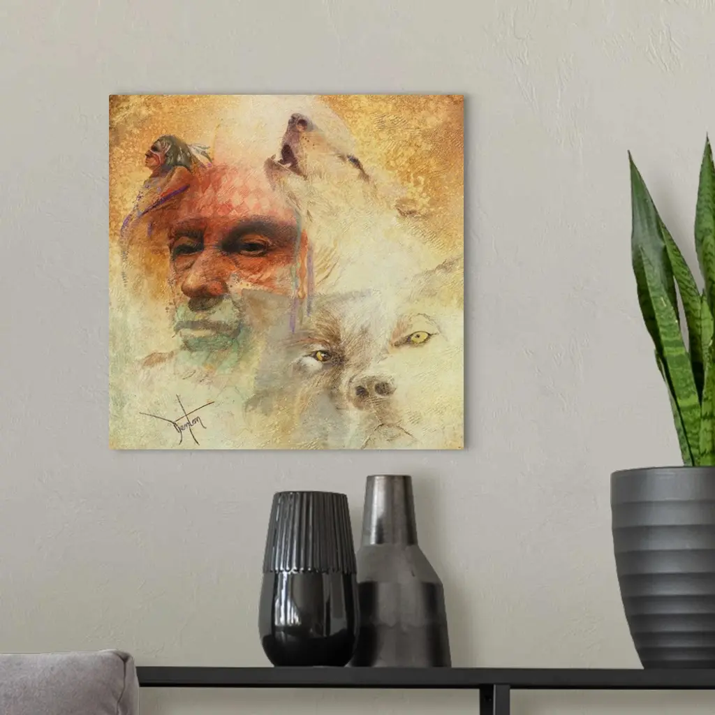 A contemporary painting of a Native American man portrait next to an image of a wolf.