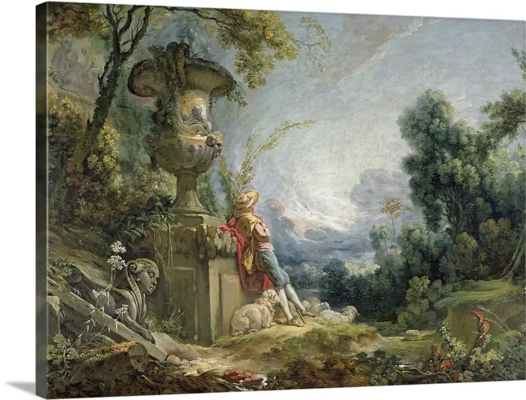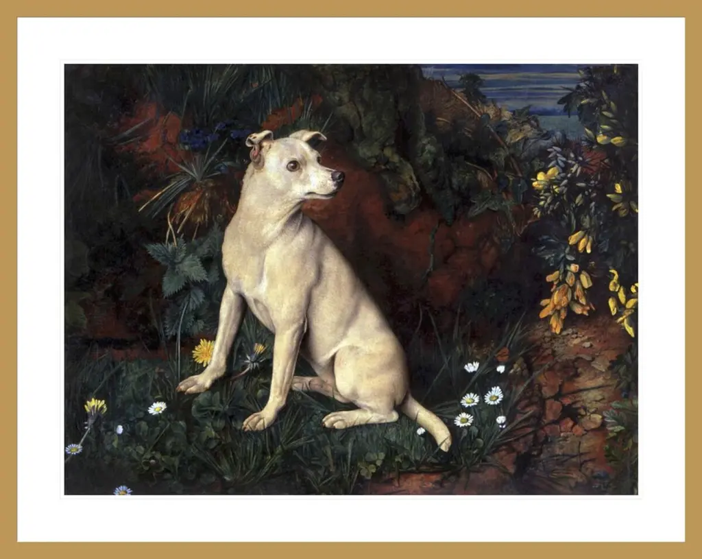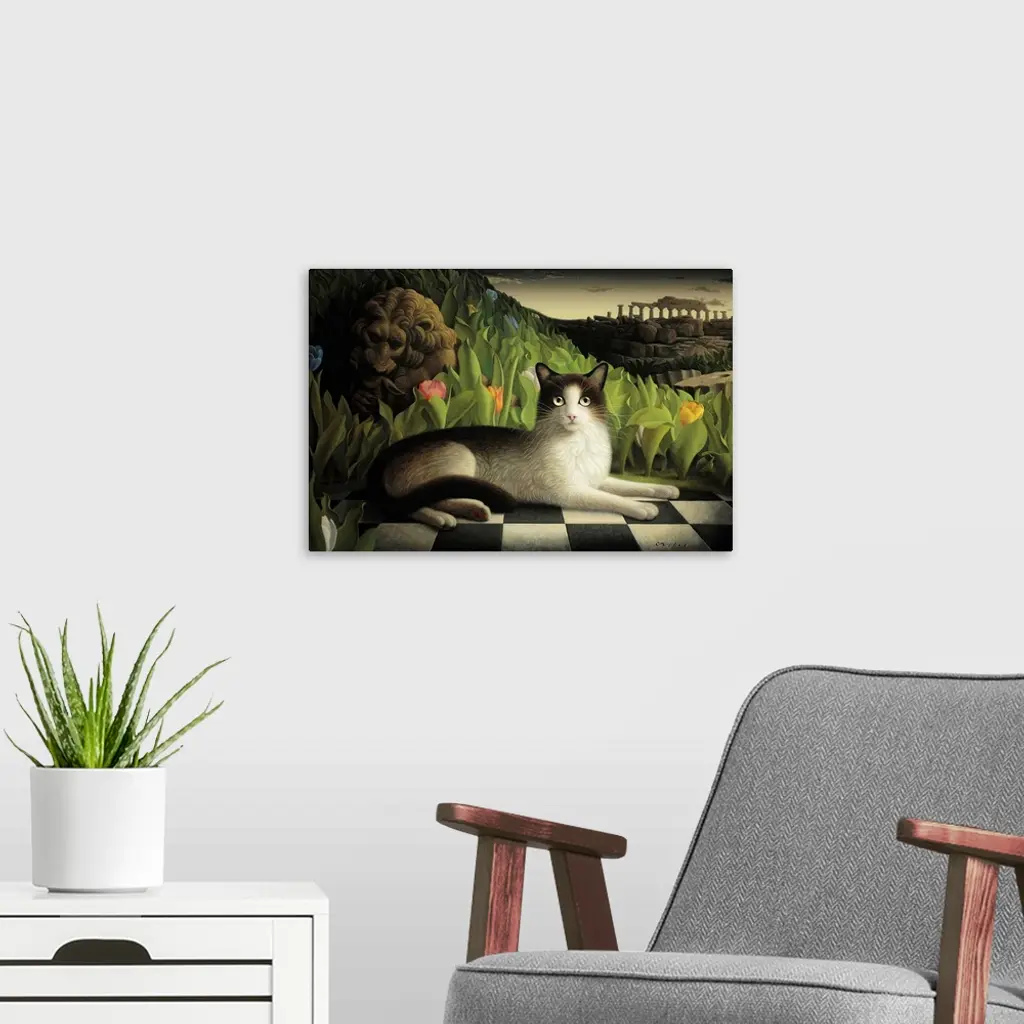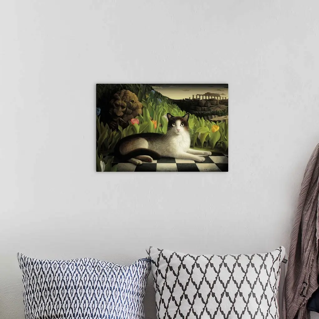 Surrealist painting of a cat lying on a tiled floor with a landscape and decrepit columned structure in the background.
